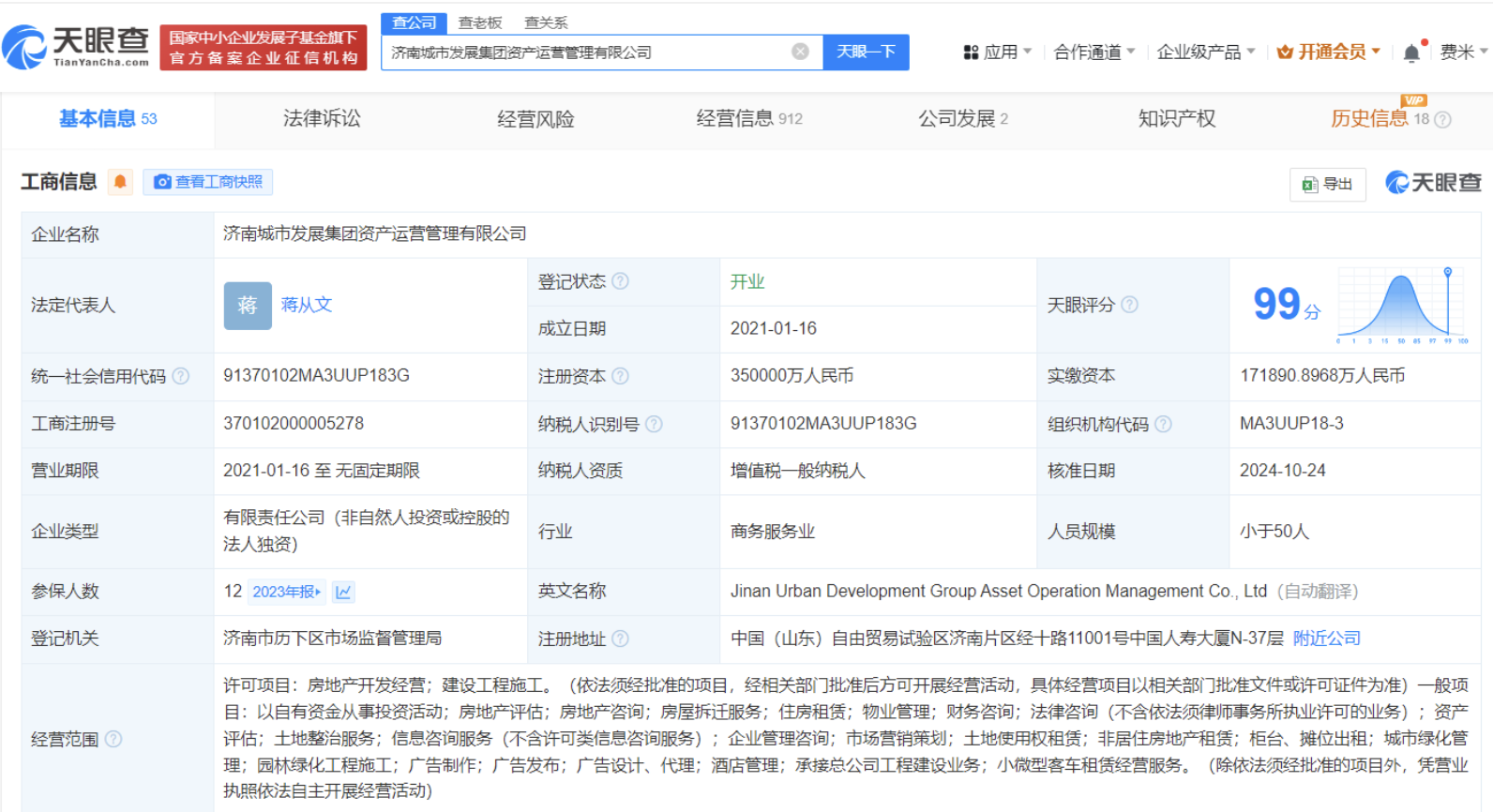 天眼查App显示,近日,济南城市发展集团资产运营管理有限公司发生工商变更,注册资本由26亿人民币增至35亿人民币,增幅约34.6%。