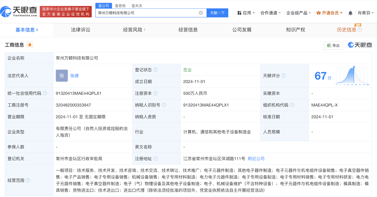 天眼查App显示,近日,常州万顿科技有限公司成立,法定代表人为张建,注册资本500万人民币,经营范围含电子元器件与机电组件设备销售、电子真空器件销售、电子产品销售、电子专用设备销售、机械设备销售、电子专用材料制造等。股东信息显示,该公司由万祥科技(301180)全资持股。