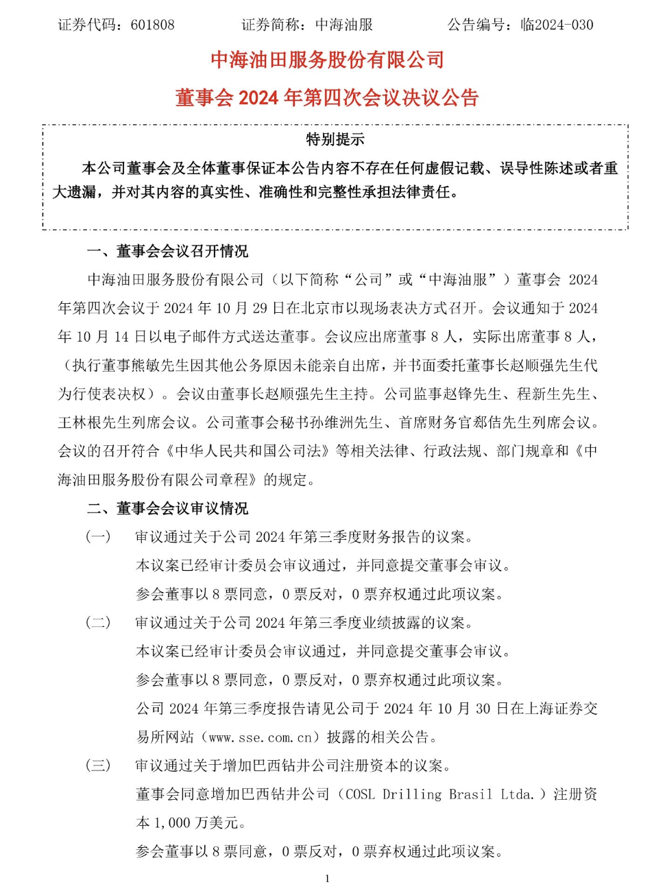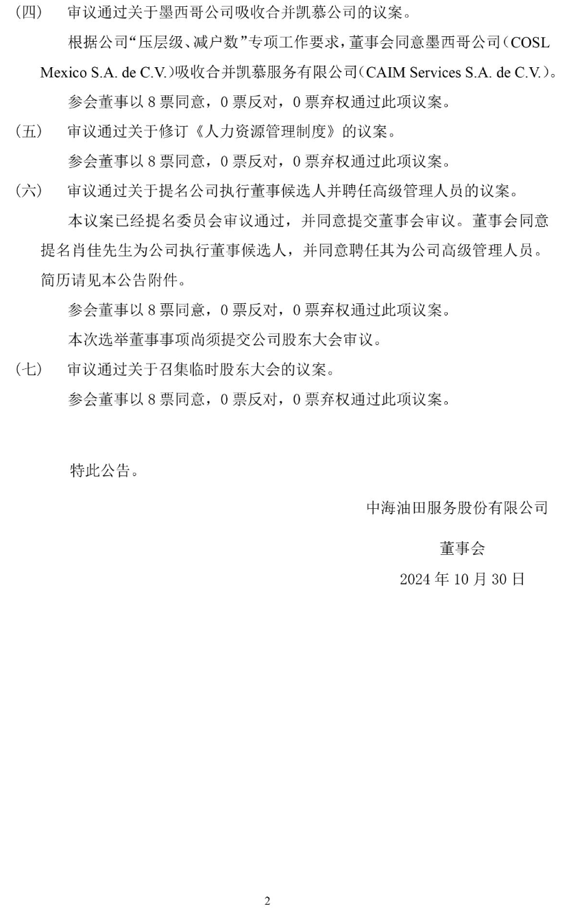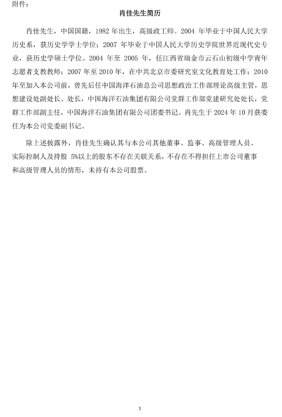 10月30日,中海油田服务股份有限公司董事会2024年第四次会议决议公告显示,董事会同意提名肖佳先生为公司执行董事候选人,并同意聘任其为公司高级管理人员。肖佳于2024年10月获委任为中海油田服务股份有限公司党委副书记。
