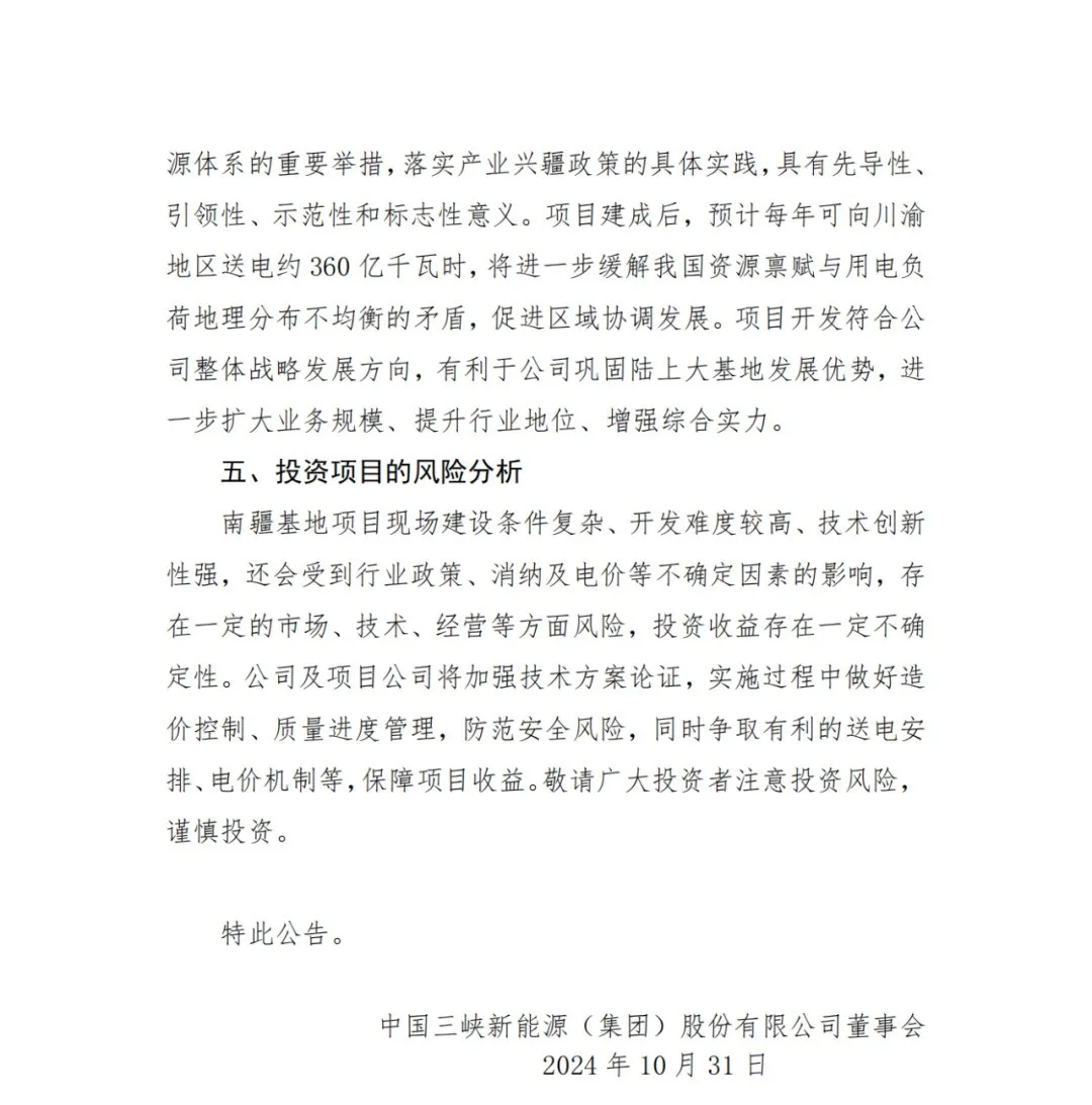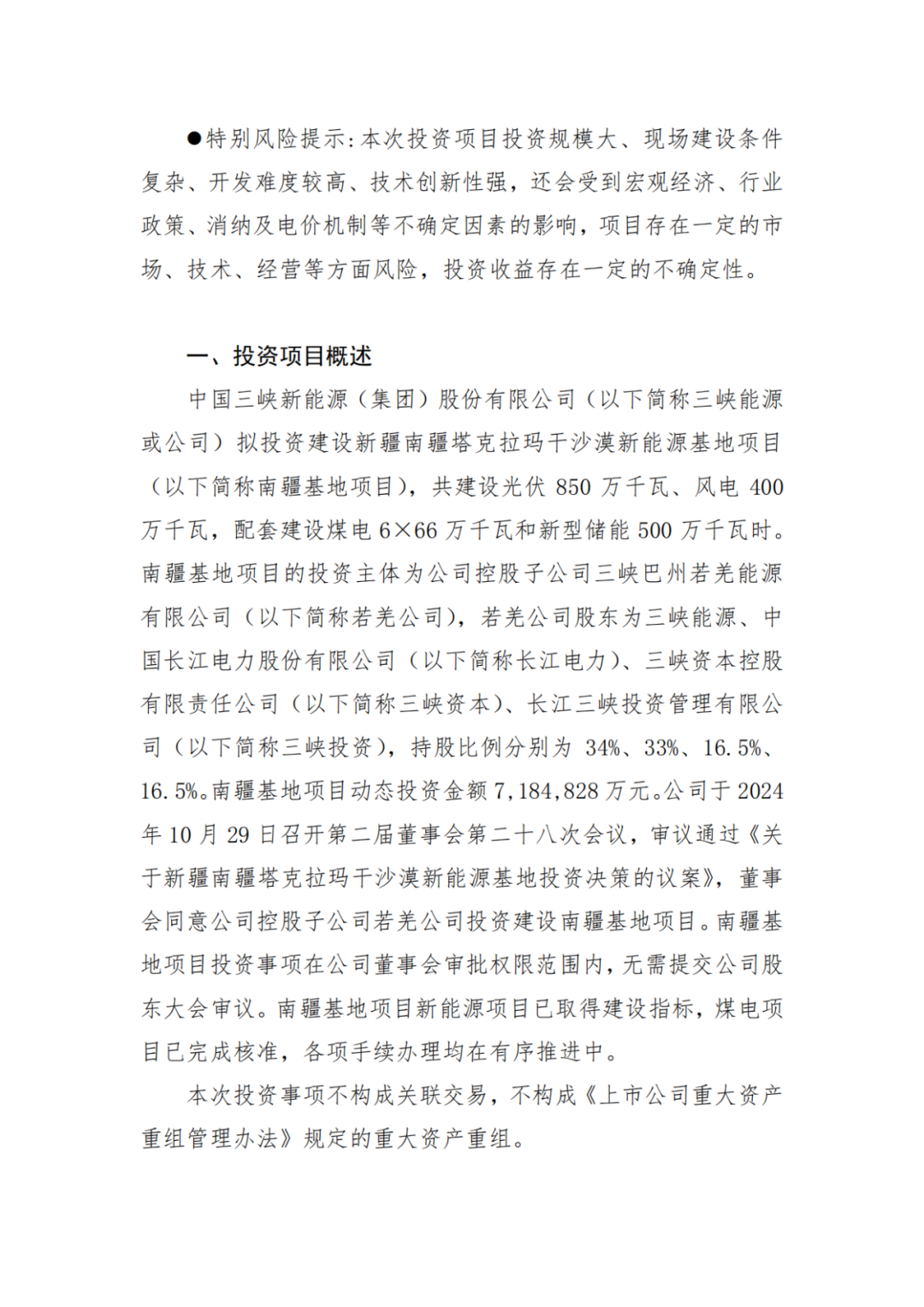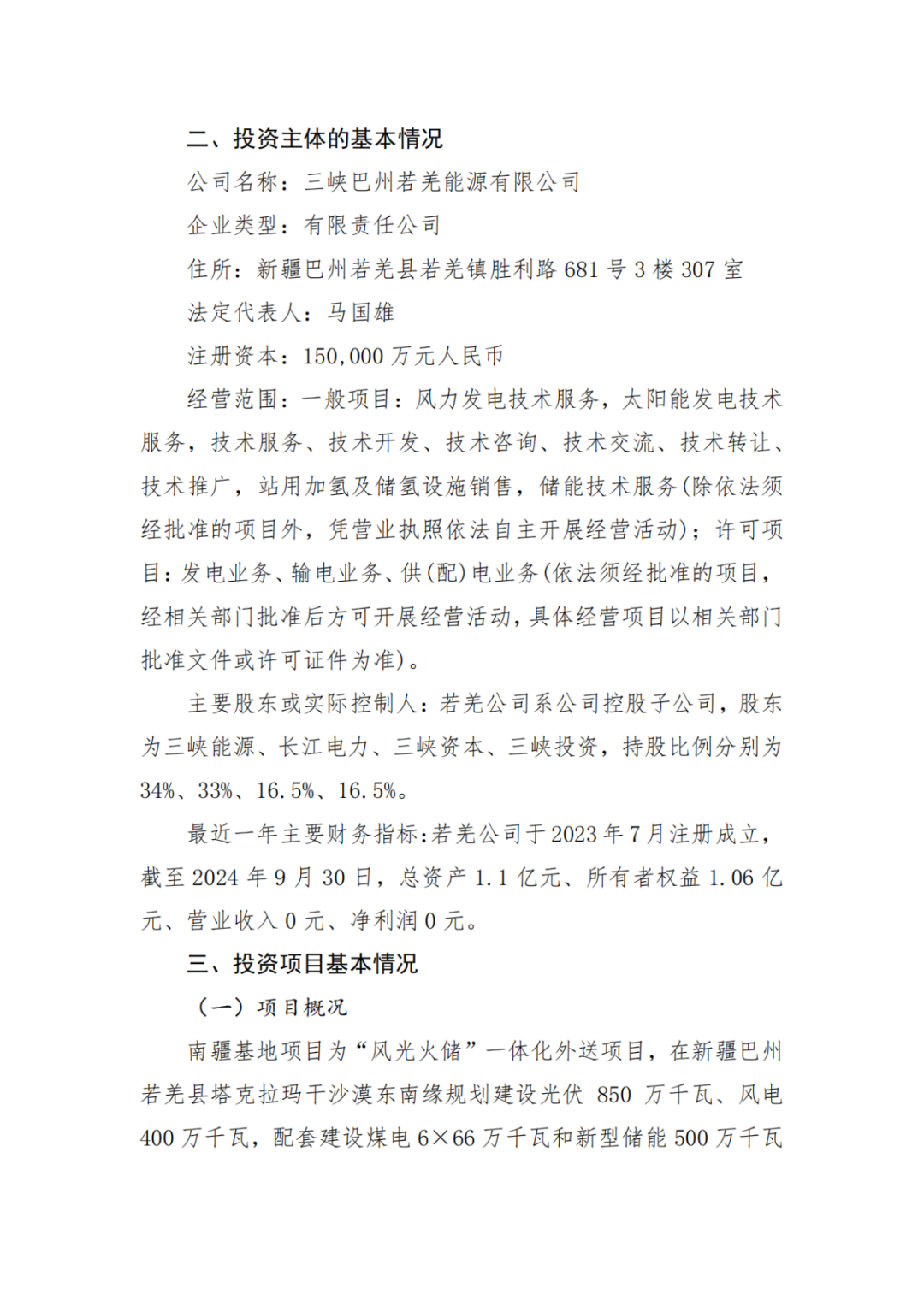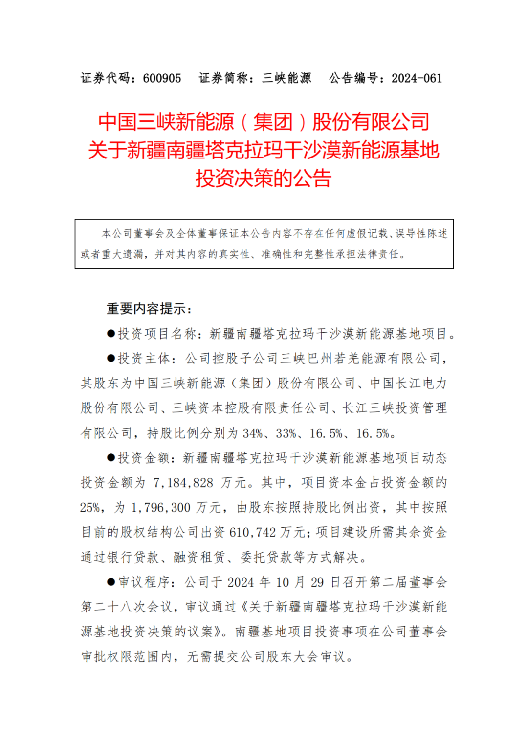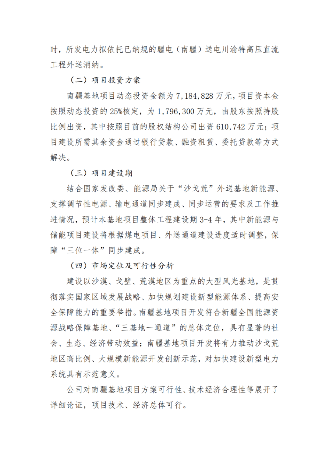 南疆基地项目动态投资金额7184828万元。项目资本金占投资金额的25%,由股东按照持股比例出资,按照目前的股权结构三峡能源出资610742万元。项目建设所需其余资金通过银行贷款、融资租赁、委托贷款等方式解决。