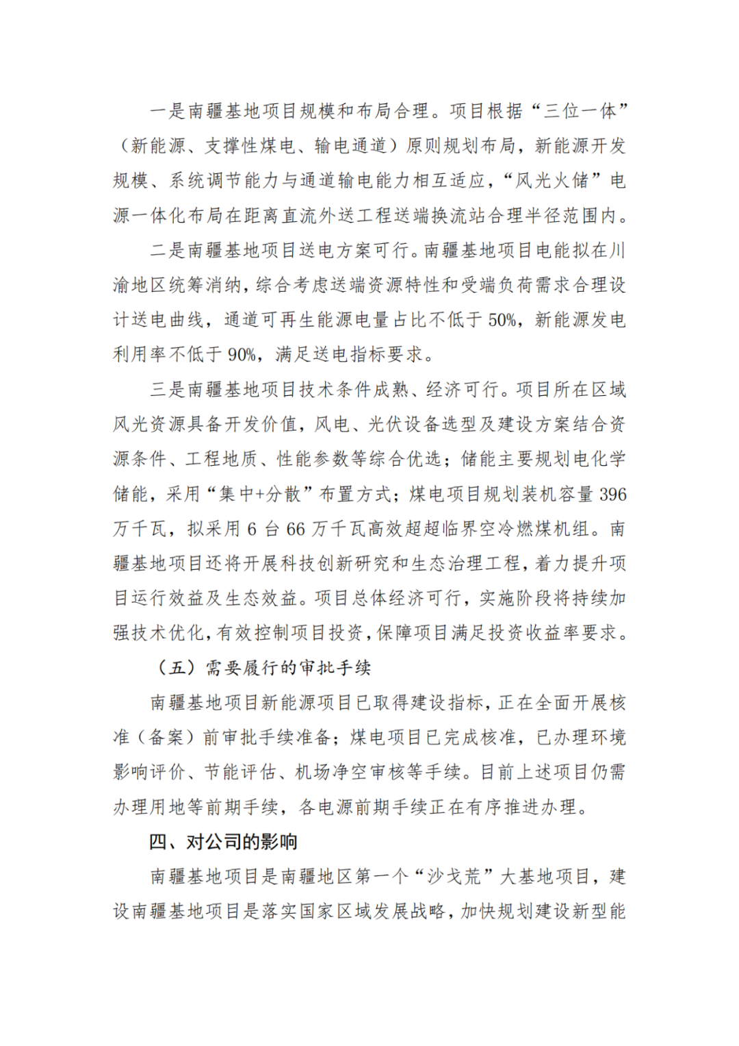 公告称,南疆基地项目为“风光火储”一体化外送项目,所发电力拟依托已纳规的疆电(南疆)送电川渝特高压直流工程外送消纳。结合国家发改委、能源局关于“沙戈荒”外送基地新能源、支撑调节性电源、输电通道同步建成、同步运营的要求及工作推进情况,预计该基地项目整体工程建设期3-4年,其中新能源与储能项目建设将根据煤电项目、外送通道建设进度适时调整,保障“三位一体”同步建成。