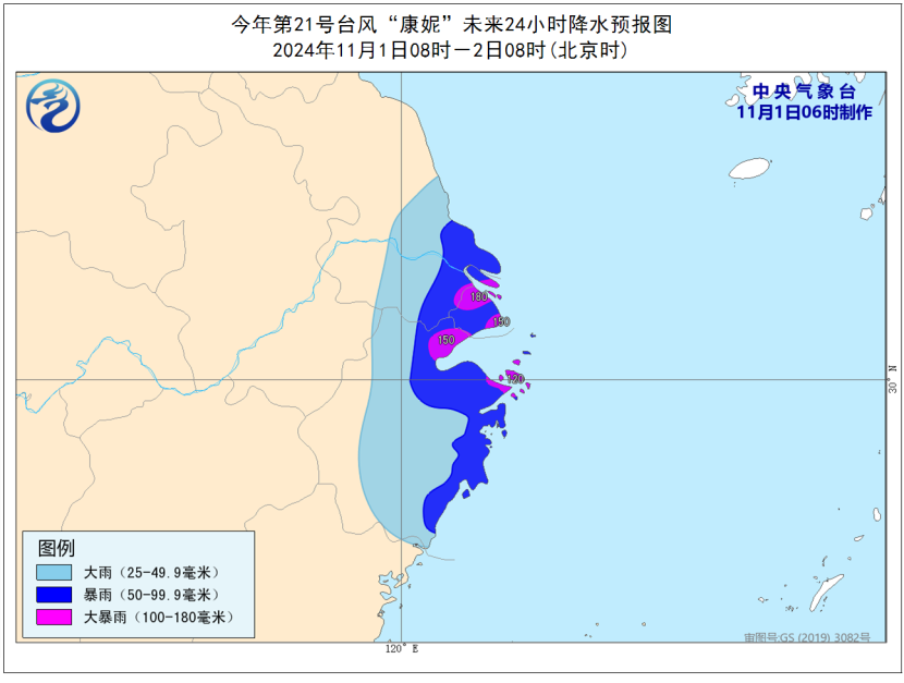 降水预报:11月1日08时至2日08时,浙江中东部、上海、江苏东南部等地将有大到暴雨,部分地区有大暴雨(100-180毫米)。
