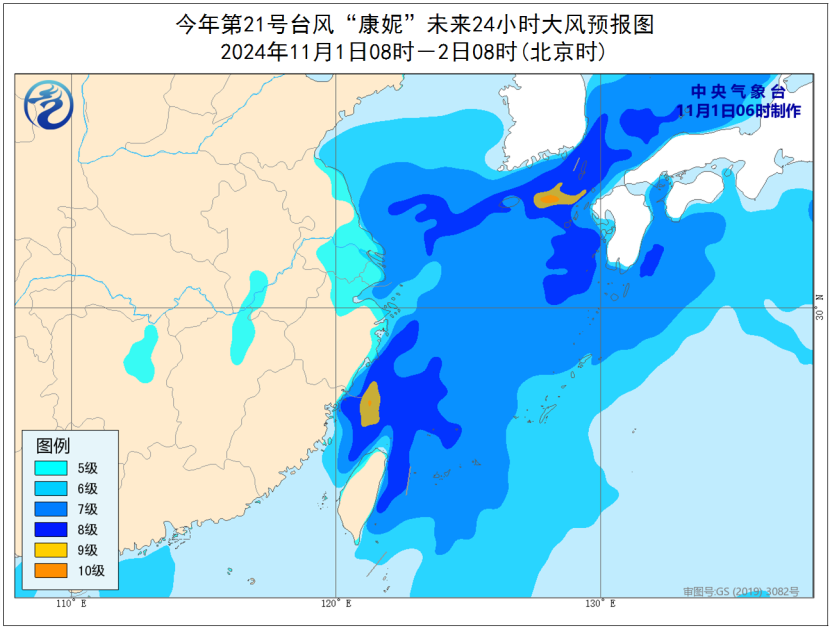 大风预报:11月1日08时至2日08时,受冷空气和“康妮”的共同影响,黄海中南部、东海大部及钓鱼岛附近海域、台湾海峡、台湾以东洋面、巴士海峡以及长江口区、杭州湾、江苏沿海、上海沿海、浙江沿海、福建中北部沿海、台湾岛北部和东部沿海将有6-8级大风,阵风9-10级,其中东海西南部部分海域的风力有9-10级,阵风11-12级。