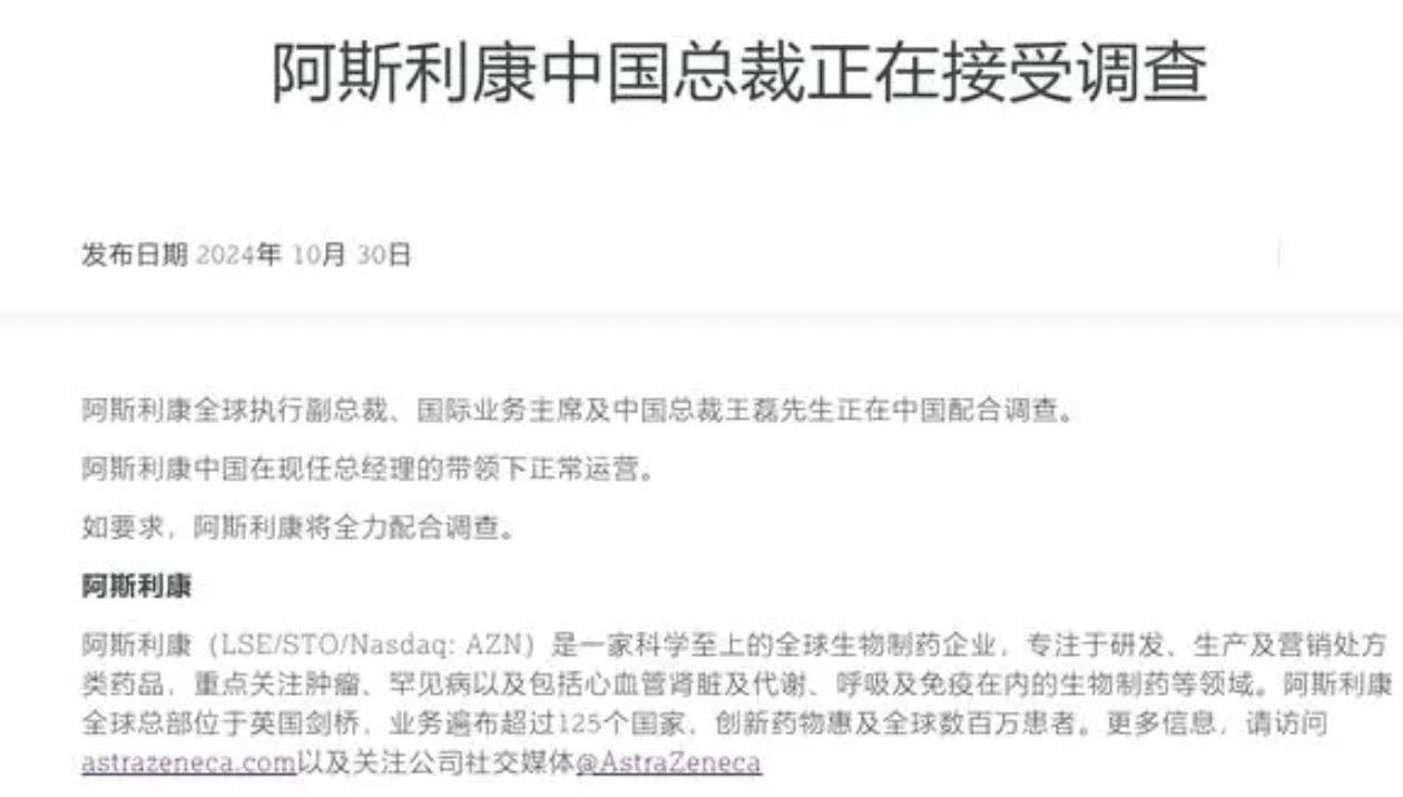 当地时间10月30日,阿斯利康全球官网和中国官网发布消息称,阿斯利康全球执行副总裁、国际业务主席及中国总裁王磊正在中国配合调查。阿斯利康中国在现任总经理的带领下正常运营。如要求,阿斯利康将全力配合调查。