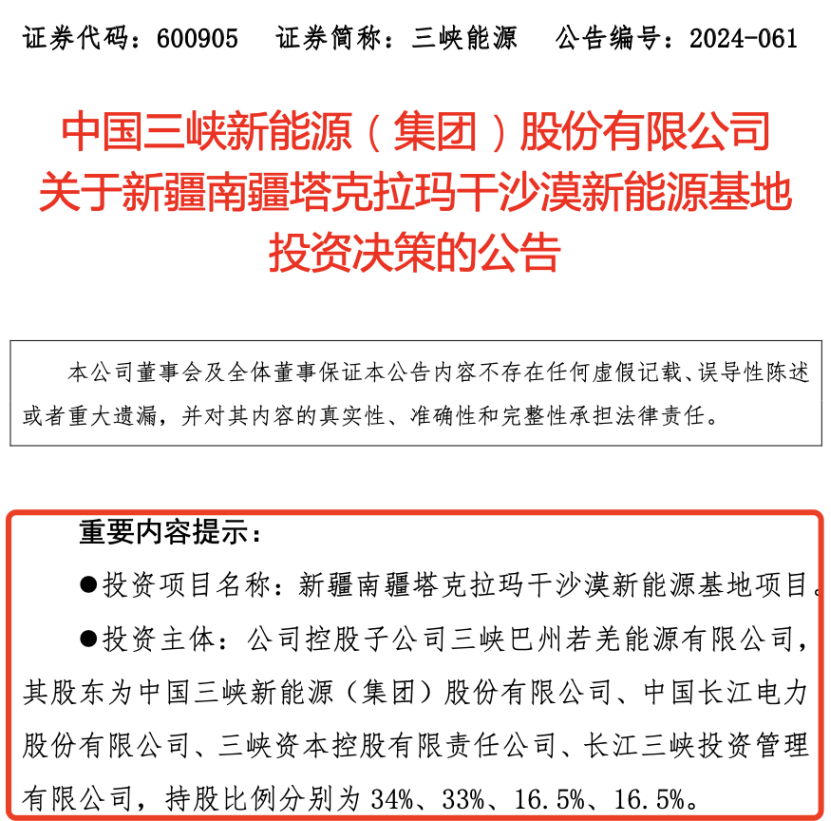 据公告显示,新疆南疆塔克拉玛干沙漠新能源基地项目的投资主体为公司控股子公司三峡巴州若羌能源有限公司(以下简称“若羌公司”),若羌公司股东为三峡能源、中国长江电力股份有限公司(以下简称“长江电力”)、三峡资本控股有限责任公司(以下简称“三峡资本”)、长江三峡投资管理有限公司(以下简称“三峡投资”),持股比例分别为34%、33%、16.5%、16.5%。