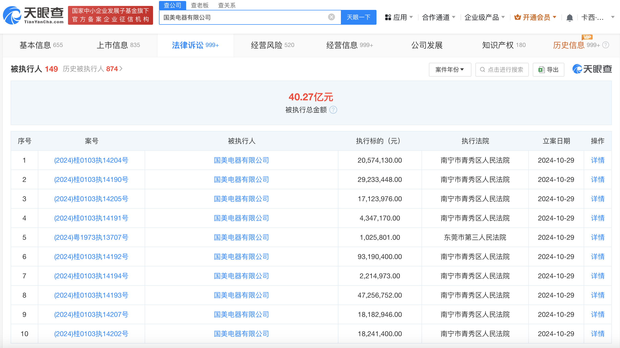 天眼查法律诉讼信息显示,10月29日,国美电器有限公司新增10条被执行人信息,执行标的合计2.5亿余元,涉及金融借款合同纠纷、租赁合同纠纷案件,部分案件被执行人还包括南宁国美电器有限公司、南宁国美物流有限公司等,执行法院为南宁市青秀区人民法院、东莞市第三人民法院。