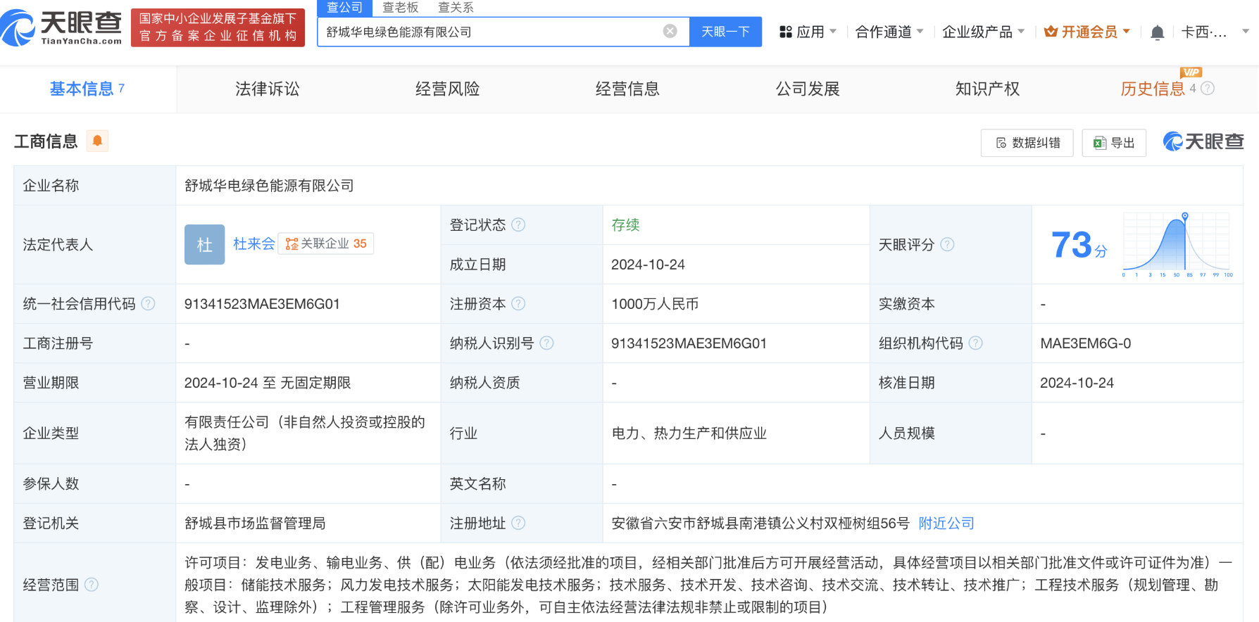 天眼查App显示,近日,舒城华电绿色能源有限公司成立,法定代表人为杜来会,注册资本1000万人民币,经营范围含发电业务、输电业务、供(配)电业务,储能技术服务,风力发电技术服务,太阳能发电技术服务等。股东信息显示,该公司由华电集团旗下华电安徽新能源有限公司全资持股。