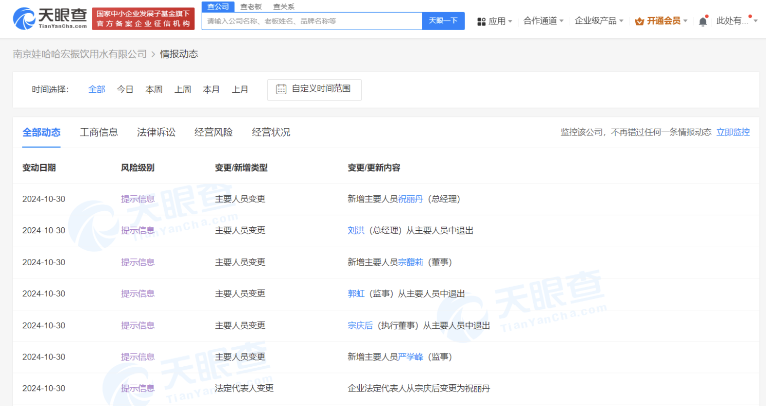 天眼查App显示,近日,南京娃哈哈宏振饮用水有限公司发生工商变更,宗庆后卸任法定代表人、执行董事,由祝丽丹接任法定代表人并担任总经理,宗馥莉出任董事,同时,多位主要人员也发生变更。