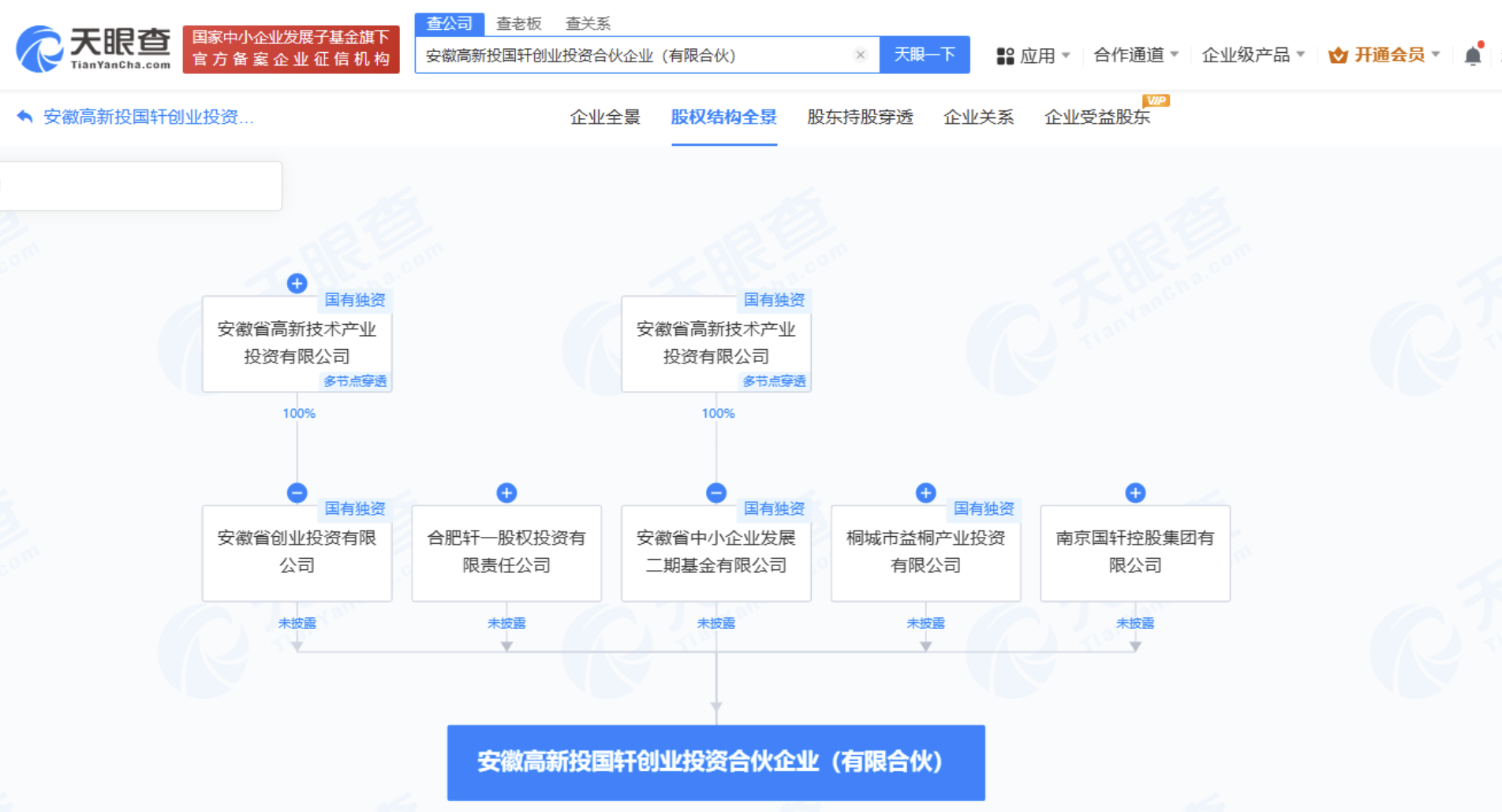 天眼查App显示,近日,安徽高新投国轩创业投资合伙企业(有限合伙)成立,执行事务合伙人为安徽省创业投资有限公司、合肥轩一股权投资有限责任公司,出资额5亿人民币,经营范围为创业投资、以自有资金从事投资活动。合伙人信息显示,该企业由安徽省高新投旗下安徽省创业投资有限公司、安徽省中小企业发展二期基金有限公司及南京国轩控股集团有限公司、桐城市益桐产业投资有限公司、合肥轩一股权投资有限责任公司共同出资。