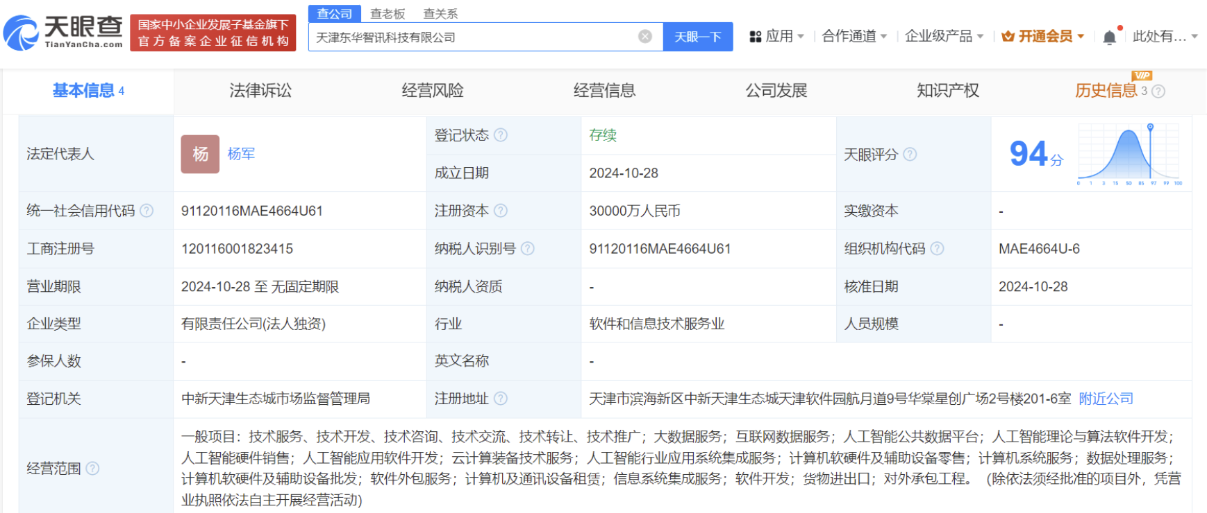 天眼查App显示,近日,天津东华智讯科技有限公司成立,法定代表人为杨军,注册资本3亿人民币,经营范围含大数据服务、互联网数据服务、人工智能公共数据平台、人工智能理论与算法软件开发、人工智能硬件销售、人工智能应用软件开发、云计算装备技术服务等。股东信息显示,该公司由东华软件(002065)全资持股。
