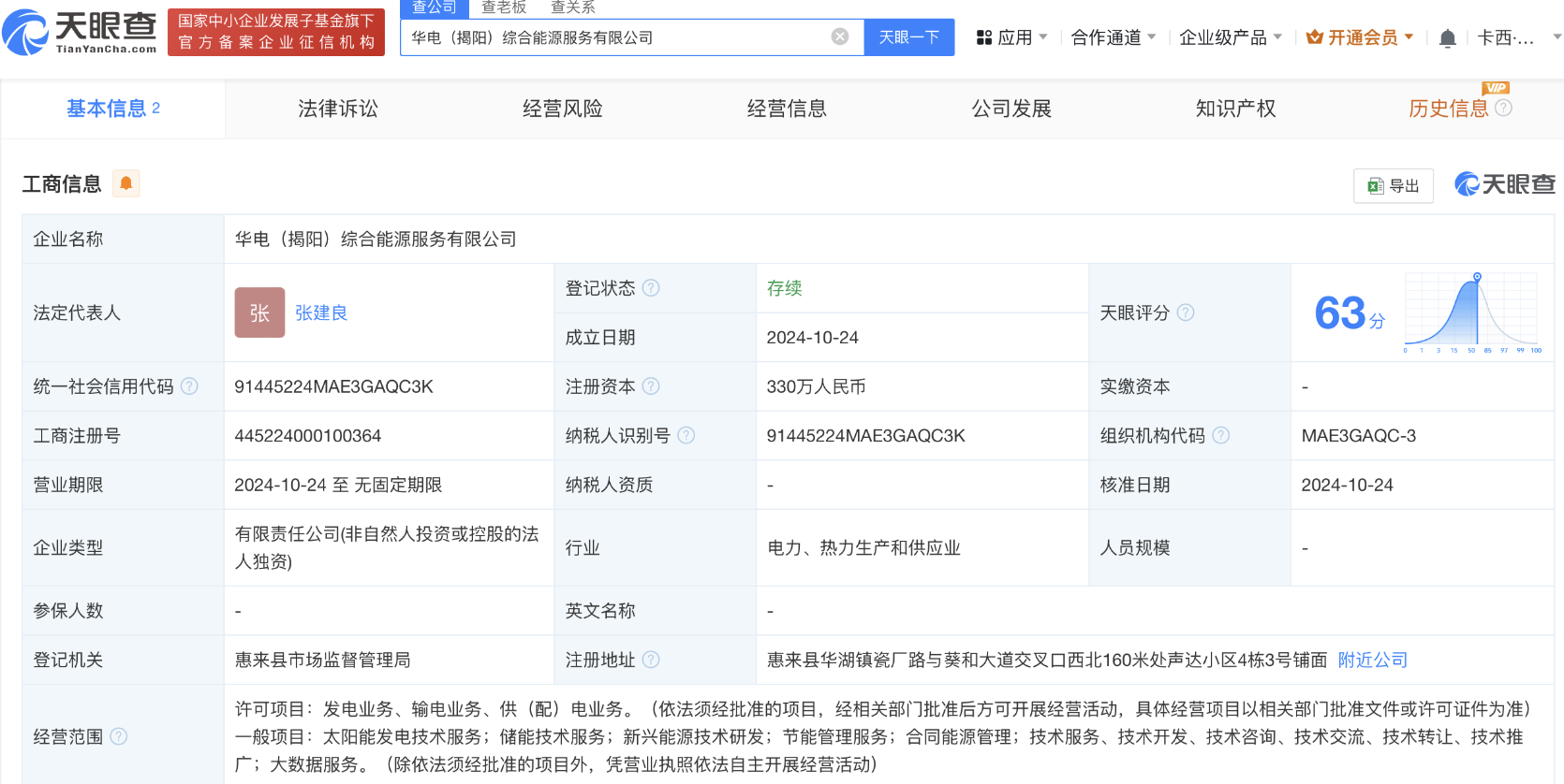 天眼查App显示,近日,华电(揭阳)综合能源服务有限公司成立,法定代表人为张建良,注册资本330万人民币,经营范围含太阳能发电技术服务、储能技术服务、新兴能源技术研发等。股东信息显示,该公司由华电集团旗下中国华电集团清洁能源有限公司全资持股。