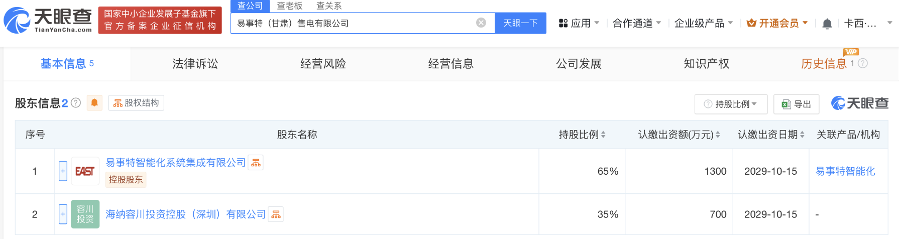 天眼查App显示,近日,易事特(甘肃)售电有限公司成立,法定代表人为胡国利,注册资本2000万人民币,经营范围含风电场相关装备销售、风力发电机组及零部件销售、充电桩销售等。股东信息显示,该公司由易事特智能化系统集成有限公司、海纳容川投资控股(深圳)有限公司分别持股65%、35%。