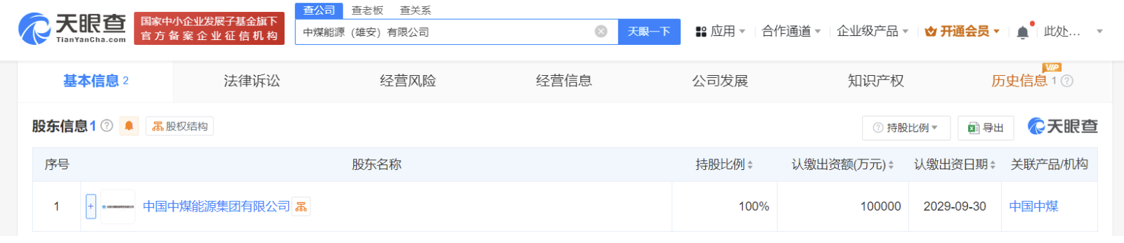 天眼查App显示,近日,中煤能源(雄安)有限公司成立,法定代表人为王国元,注册资本10亿人民币,经营范围含煤炭开采,非煤矿山矿产资源开采,发电业务、输电业务、供(配)电业务,建设工程施工,输电、供电、受电电力设施的安装、维修和试验等。股东信息显示,该公司由中国中煤能源集团有限公司全资持股。