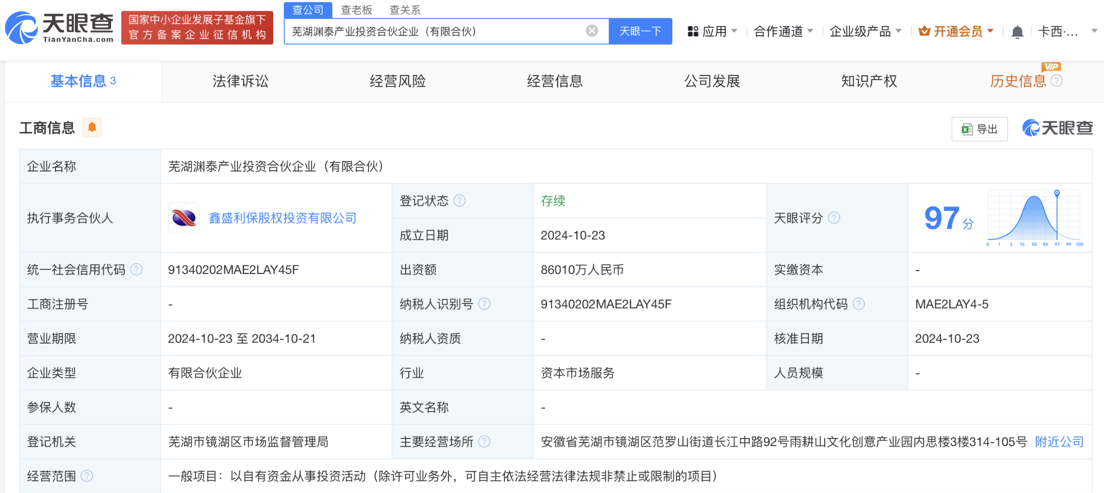 天眼查App显示,近日,芜湖渊泰产业投资合伙企业(有限合伙)成立,执行事务合伙人为鑫盛利保股权投资有限公司,出资额约8.6亿人民币,经营范围为以自有资金从事投资活动。合伙人信息显示,该企业由中国信达(HK.01359)及旗下鑫盛利保股权投资有限公司共同出资。