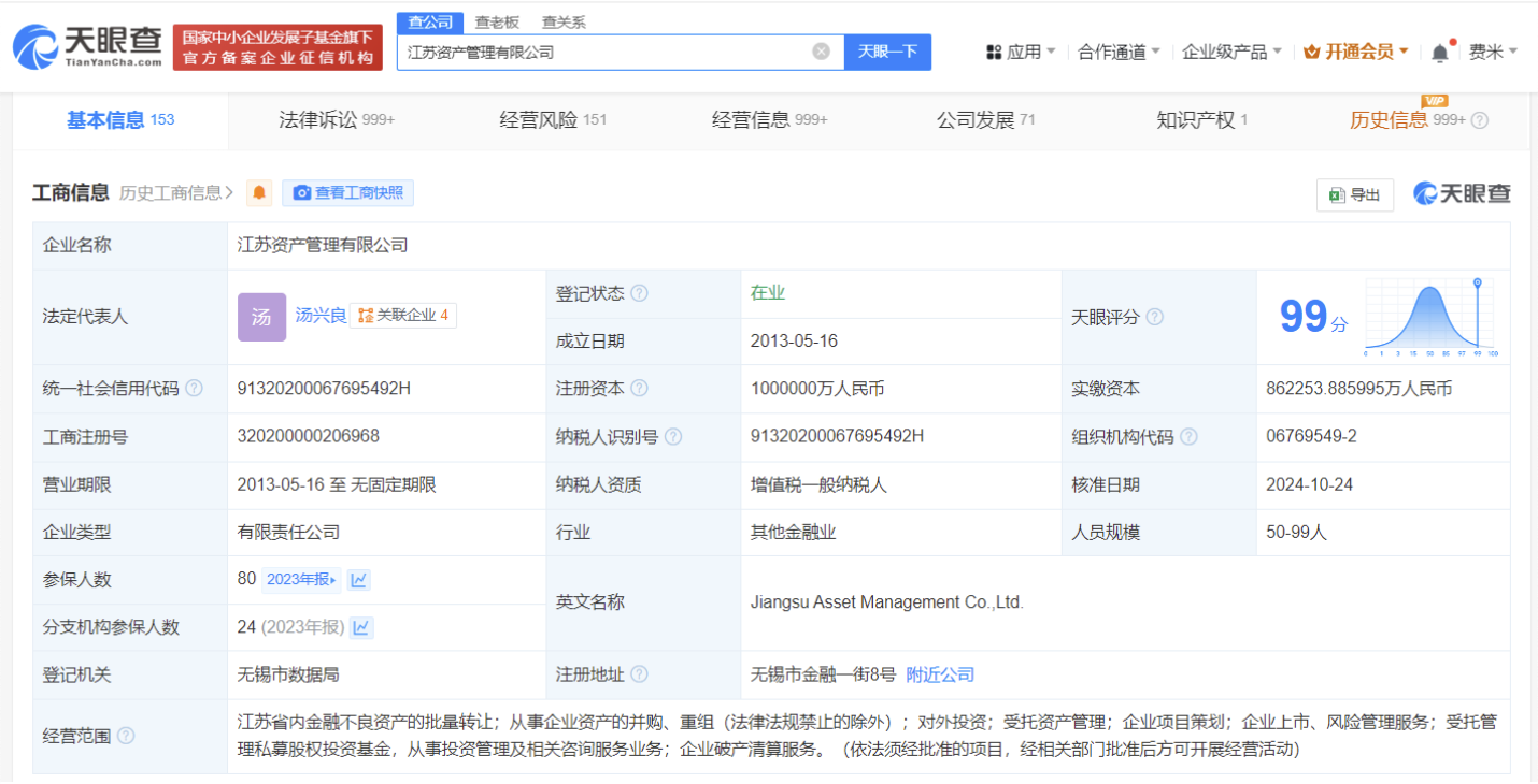 天眼查App显示,近日,江苏资产管理有限公司发生工商变更,注册资本由约90.7亿人民币增至100亿人民币。