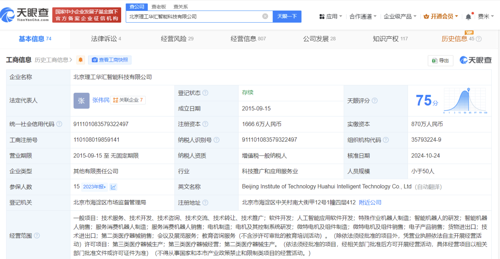 北京理工华汇智能科技有限公司成立于2015年9月,法定代表人为张伟民,经营范围含人工智能应用软件开发、特殊作业机器人制造、智能机器人的研发、智能机器人销售、服务消费机器人制造、服务消费机器人销售等,现由黄强、嘉兴稳丰企业管理合伙企业(有限合伙)、嘉兴顶飏企业管理合伙企业(有限合伙)及上述新增股东等共同持股。官网显示,该公司是北京理工大学学科性公司,专注于人形机器人及其核心部件的开发与应用。