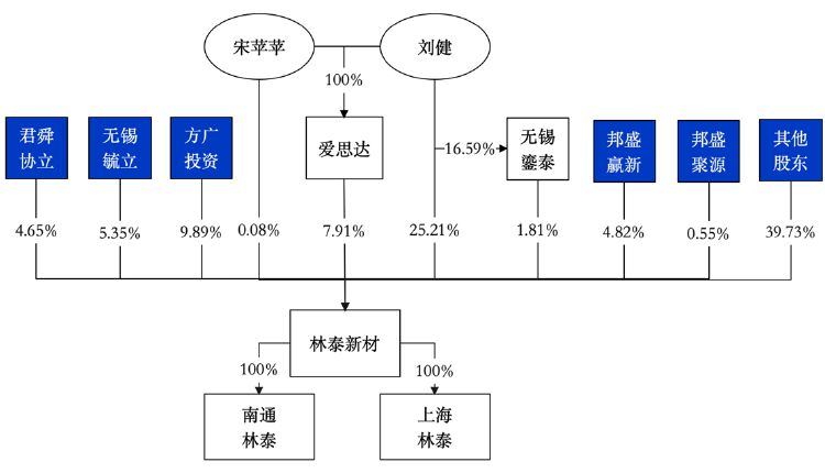 股权方面,招股书显示,刘健、宋苹苹夫妻二人为林泰新材实际控制人。刘健通过直接持有和间接持有合计控制林泰新材34.93%的股份,系公司控股股东,其配偶宋苹苹直接持有公司0.08%的股份,两人合计控制林泰新材35.00%的股份。