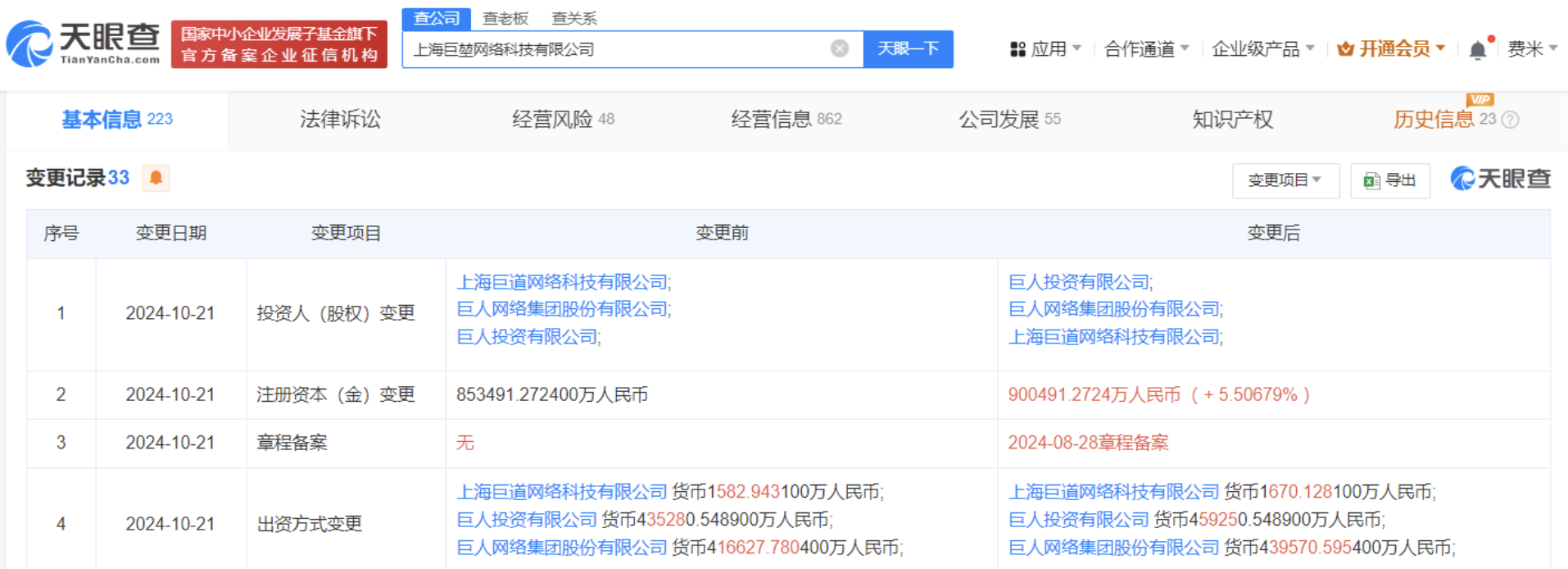 天眼查App显示,近日,上海巨堃网络科技有限公司发生工商变更,注册资本由约85亿人民币增至约90亿人民币。