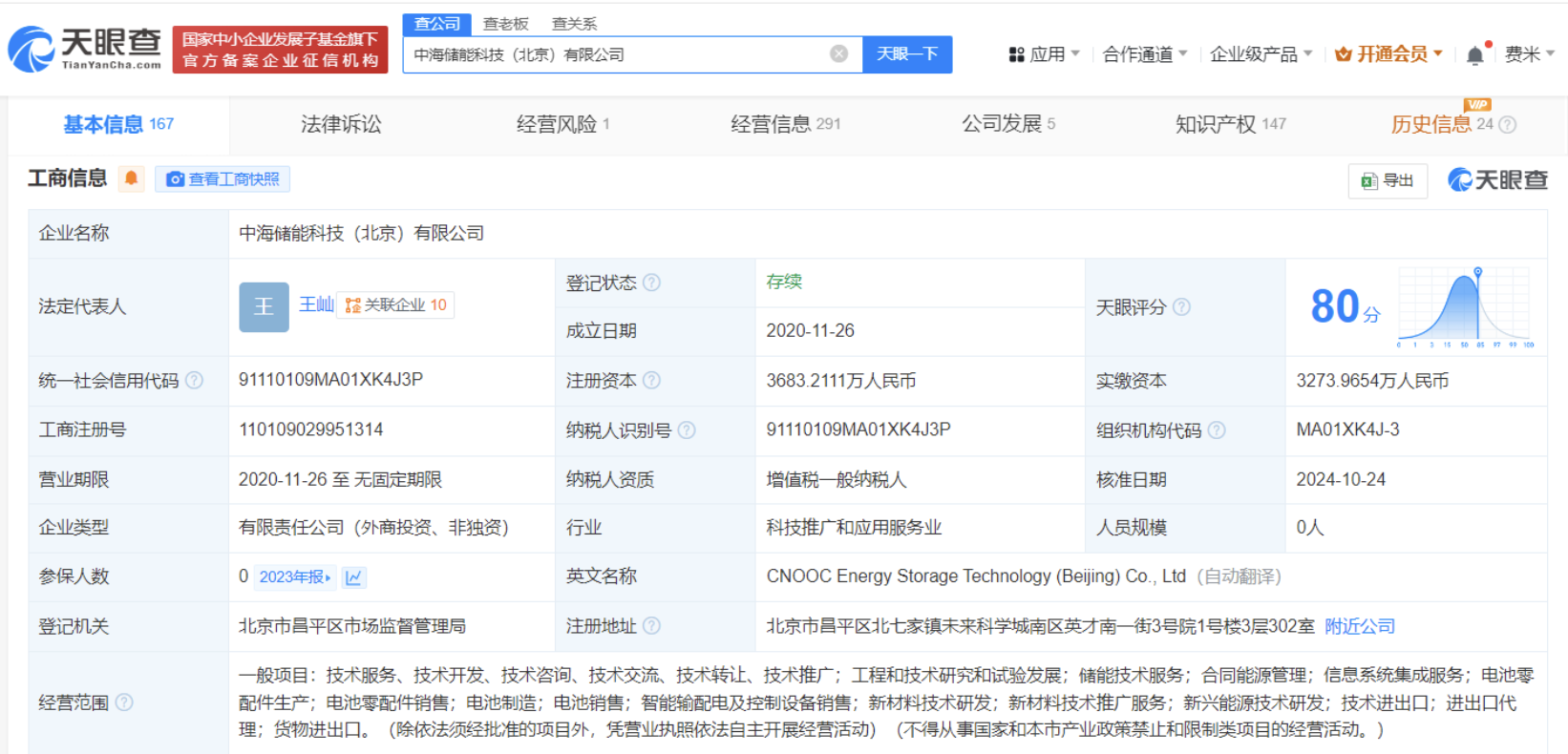 中海储能科技(北京)有限公司成立于2020年11月,法定代表人为王屾,经营范围含工程和技术研究和试验发展、储能技术服务、合同能源管理、电池零配件生产、电池零配件销售等,现由王屾、北京中海储能企业管理中心(有限合伙)、曾建华及上述新增股东等共同持股。官网显示,中海储能专注于新型大容量电化学储能产品——铁铬液流电池储能系统的研究开发。