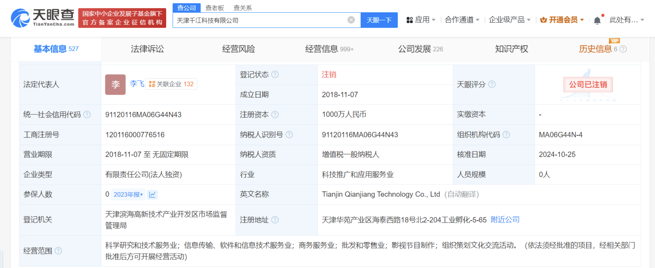 天眼查App显示,近日,天津千江科技有限公司企业状态由存续变更为注销。