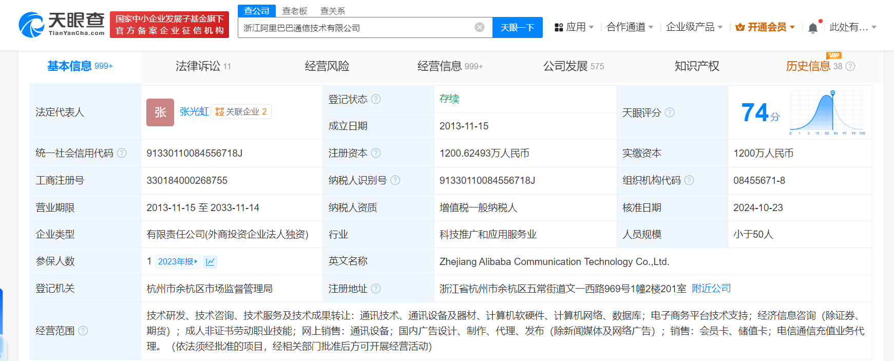 浙江阿里巴巴通信技术有限公司成立于2013年11月,注册资本约1200.62万人民币,经营范围含通讯技术、通讯设备及器材、计算机软硬件、计算机网络、数据库,电子商务平台技术支持,经济信息咨询等,由淘宝(中国)软件有限公司全资持股。