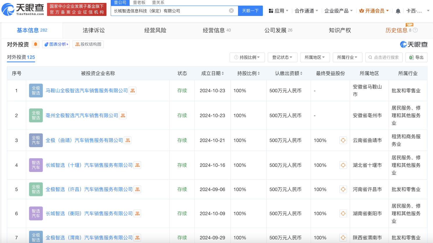 天眼查App显示,近日,马鞍山全极智选汽车销售服务有限公司、亳州全极智选汽汽车销售有限公司成立,法定代表人均为谭健,注册资本均为500万人民币,经营范围均包含汽车零配件零售、汽车销售、摩托车及零配件零售等。股东信息显示,上述两公司均由长城汽车(601633)旗下长城智选信息科技(保定)有限公司全资持股。对外投资信息显示,近期,长城智选信息科技(保定)有限公司已在曲靖、十堰、衡阳等地成立汽车销售服务公司。