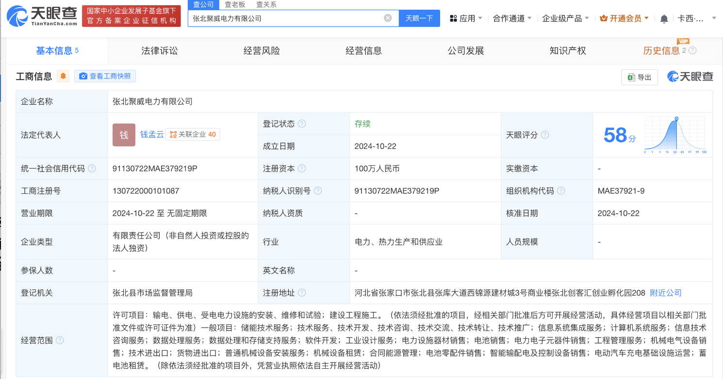 天眼查App显示,近日,张北聚威电力有限公司成立,法定代表人为钱孟云,注册资本100万人民币,经营范围含电池零配件销售、智能输配电及控制设备销售、电动汽车充电基础设施运营等。股权全景穿透图显示,该公司由浙江超威电力有限公司全资持股,后者为超威电源集团有限公司全资子公司。