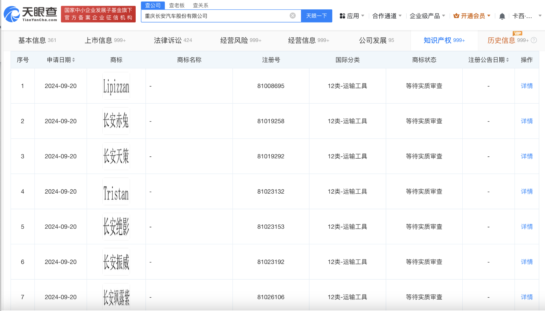 天眼查知识产权信息显示,近日,长安汽车(000625)申请注册多枚“长安赤兔”“长安元霸”“长安的卢”“长安绝影”“长安青骓”等商标,国际分类均为运输工具,当前商标状态均为等待实质审查。