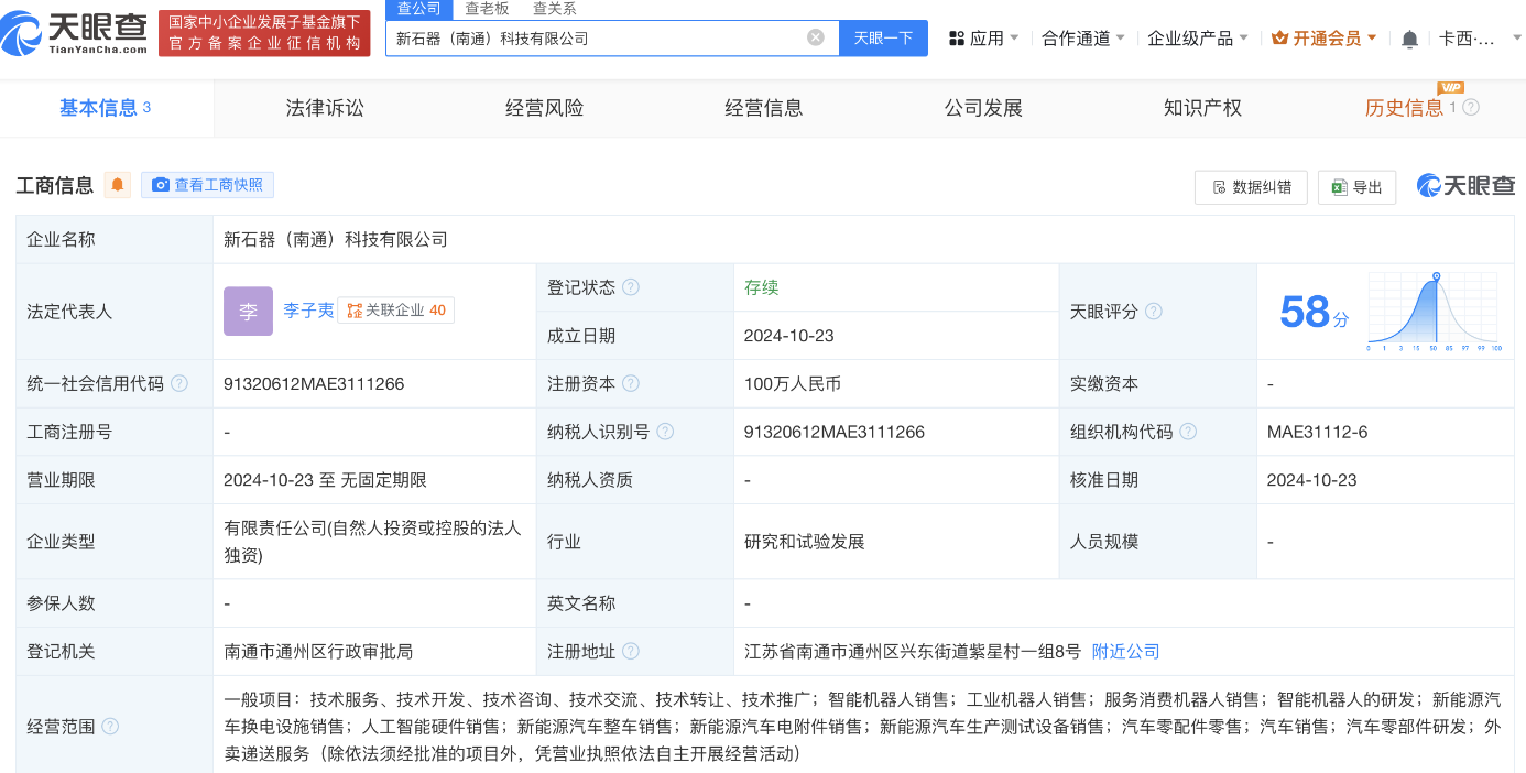 天眼查App显示,近日,新石器(南通)科技有限公司成立,法定代表人为李子夷,注册资本100万人民币,经营范围含智能机器人的研发、人工智能硬件销售、新能源汽车整车销售等。股东信息显示,该公司由新石器慧通(北京)科技有限公司全资持股。