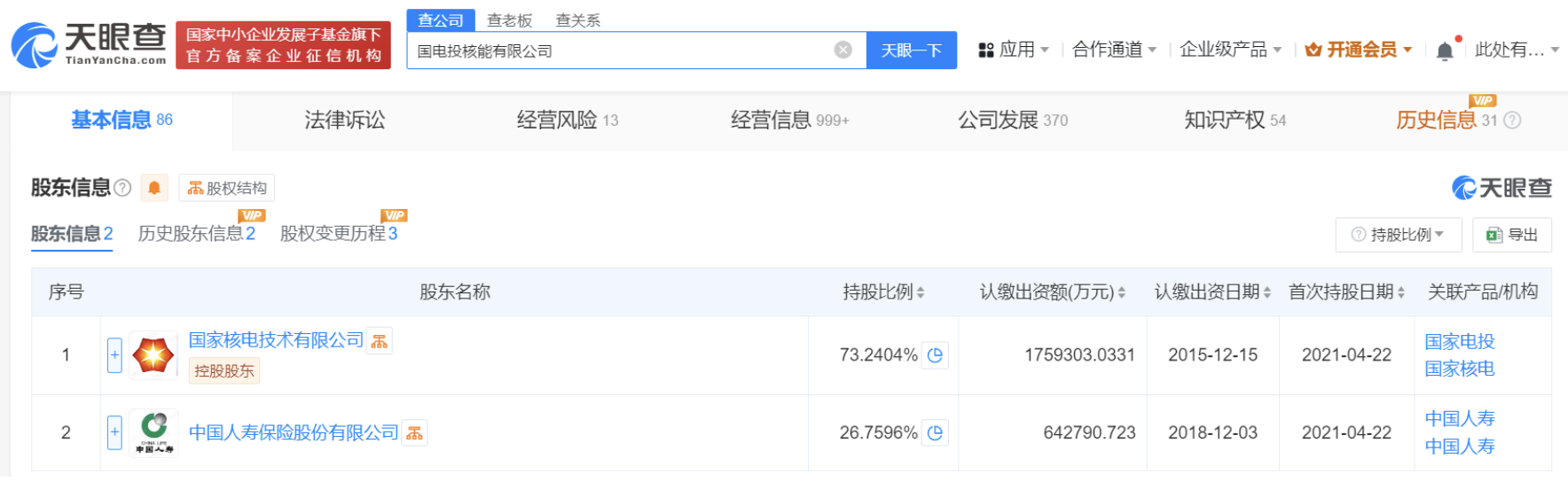 该公司成立于2004年12月,法定代表人为郝宏生,经营范围含发电业务、输电业务、供(配)电业务,供电业务,以自有资金从事投资活动,自有资金投资的资产管理服务,核电设备成套及工程技术研发等。股东信息显示,该公司由国家电投旗下国家核电技术有限公司以及中国人寿(601628)分别持股约73%、27%。
