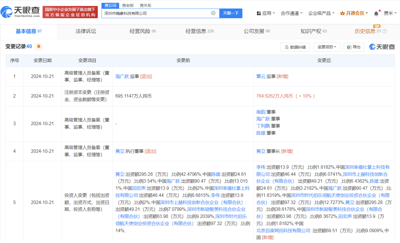 天眼查App显示,近日,深圳市镜象科技有限公司发生工商变更,新增北京百度网讯科技有限公司为股东,注册资本由约695.1万人民币增至约764.6万人民币,同时多位董事和监事发生变更。