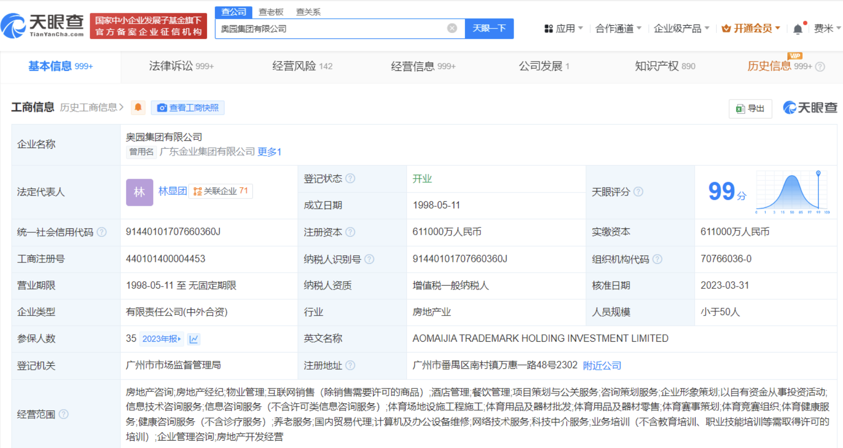 奥园集团有限公司成立于1998年5月,法定代表人为林显团,注册资本61.1亿人民币,经营范围含房地产咨询、房地产经纪、物业管理、互联网销售等,由广东奥园置业有限公司、ADD LION PROFITS LIMITED共同持股。风险信息显示,该公司现存160余条被执行人信息,被执行总金额超155亿元。此外,该公司还存在多条限制消费令、失信被执行人(老赖)及终本案件信息。