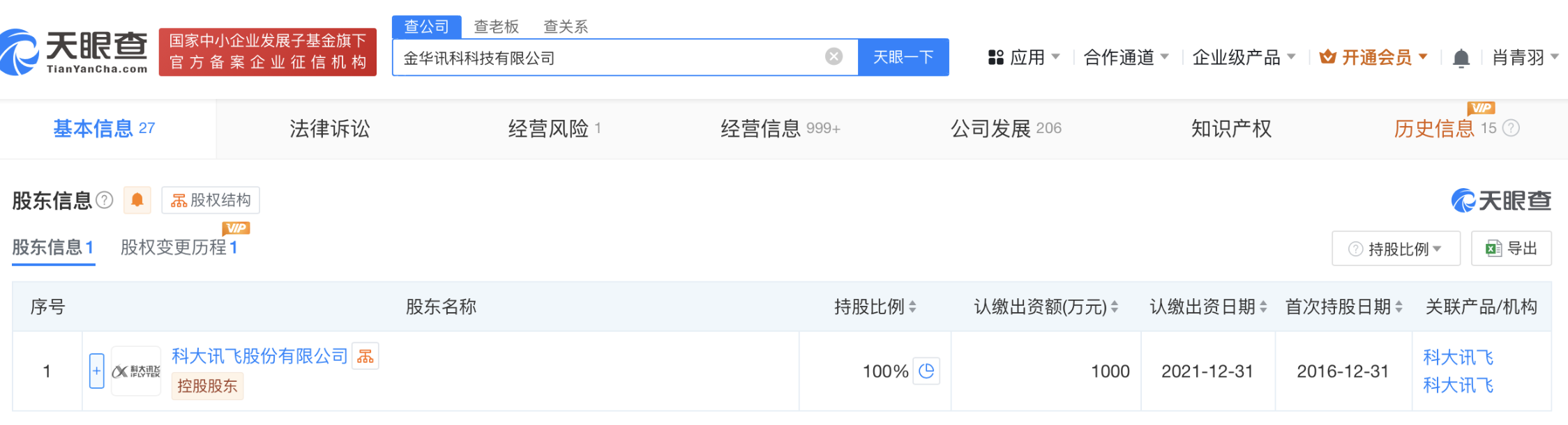 金华讯科科技有限公司成立于2016年3月,法定代表人为孙东平,注册资本1000万人民币,经营范围含建筑智能化系统工程、楼宇自控系统工程、防盗监控系统工程、消防报警系统工程、建筑装修装饰工程、安全防范工程、园林景观工程、防雷系统工程等。股东信息显示,该公司由科大讯飞(002230)全资持股。