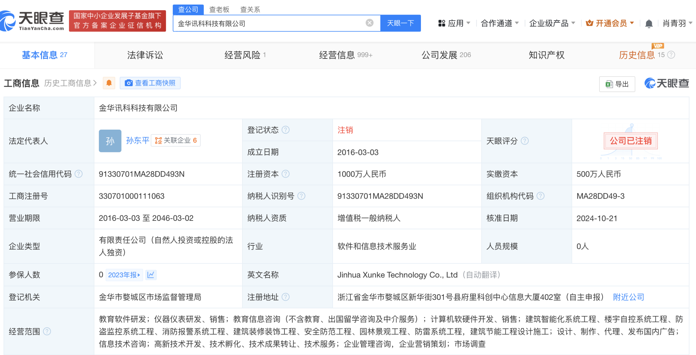 天眼查App显示,近日,金华讯科科技有限公司企业状态由存续变更为注销。今年9月,该公司已发布简易注销公告。