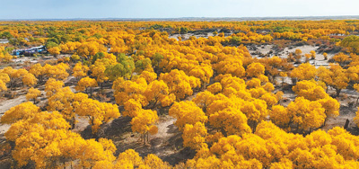 内蒙古阿拉善盟额济纳旗大漠深处,大片胡杨林生机盎然。多年来,得益于黑河调水,以及保护区工作人员和农牧民的共同守护,当地绿洲面积扩大,沙地面积减少,生物多样性日益丰富,生态屏障更加牢固。在胡杨林景区的带动下,生态旅游蓬勃发展。