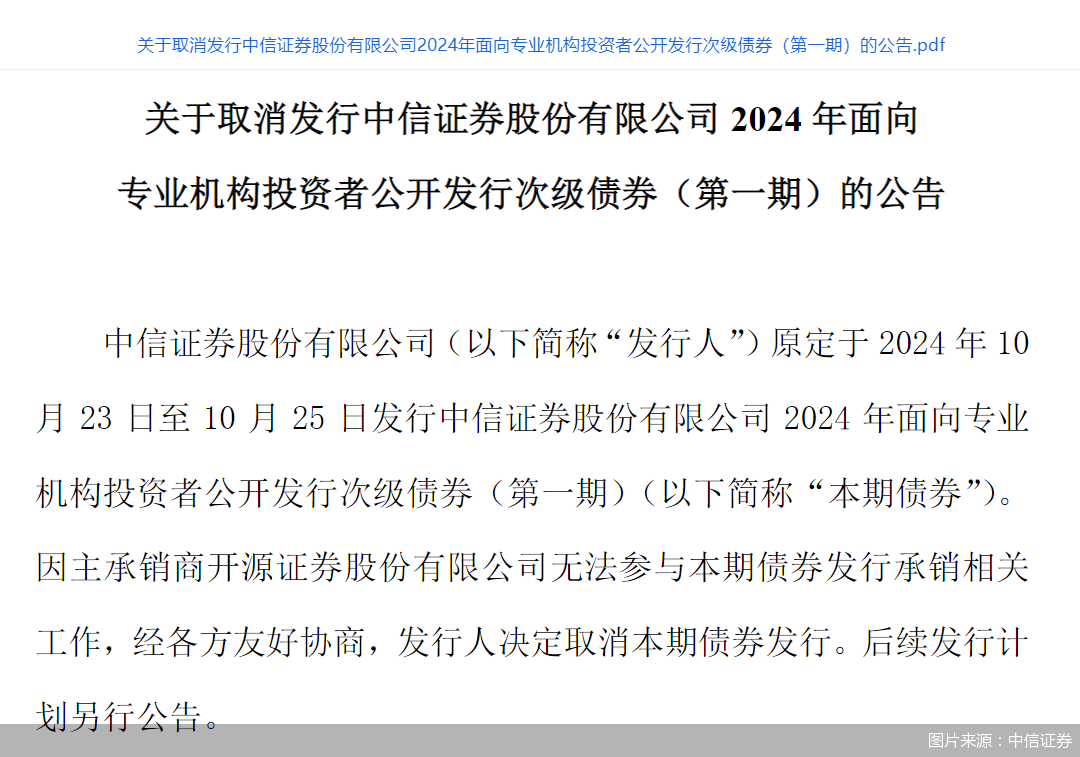 受累于主承销商受罚,中信证券60亿元债券被迫取消发行。10月22日,中信证券发布公告表示,公司原定于10月23日—25日发行中信证券2024年面向专业机构投资者公开发行次级债券(第一期),因主承销商开源证券无法参与债券发行承销相关工作,发行人决定取消债券发行。