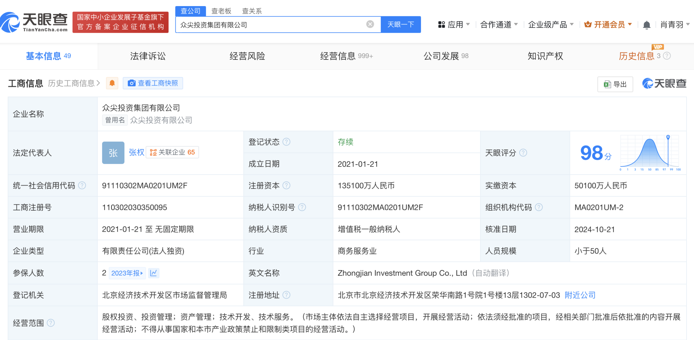 天眼查App显示,近日,众尖投资集团有限公司发生工商变更,注册资本由5.01亿人民币增至13.51亿人民币。法定代表人从李东辉变更为张权,同时,多位主要人员变更。