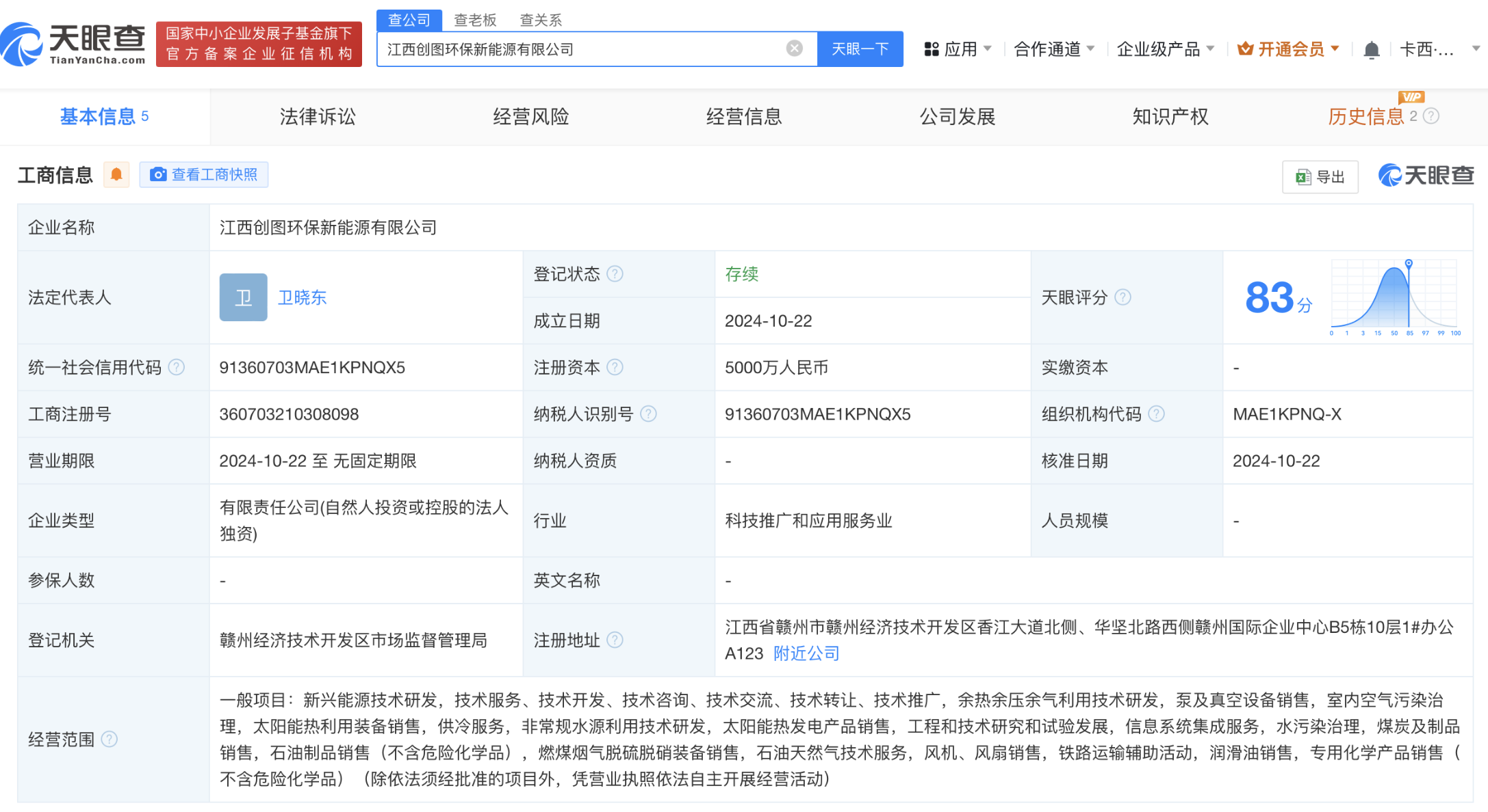 天眼查App显示,近日,江西创图环保新能源有限公司成立,法定代表人为卫晓东,注册资本5000万人民币,经营范围含室内空气污染治理、太阳能热利用装备销售、非常规水源利用技术研发等。股东信息显示,该公司由华能新能源股份有限公司全资持股。