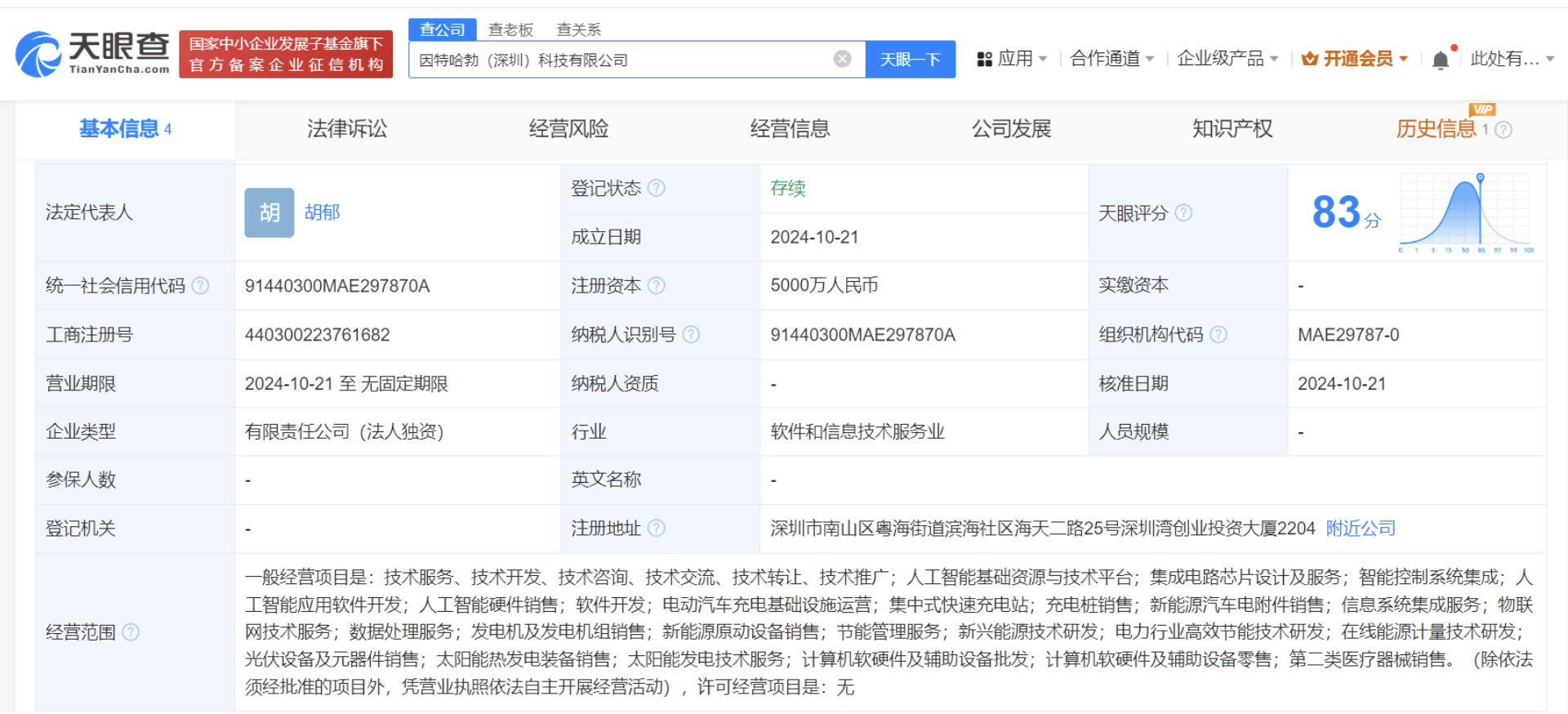天眼查App显示,近日,因特哈勃(深圳)科技有限公司成立,法定代表人为胡郁,注册资本5000万人民币,经营范围含人工智能基础资源与技术平台、集成电路芯片设计及服务、智能控制系统集成、充电桩销售、新能源汽车电附件销售、电动汽车充电基础设施运营、发电机及发电机组销售等。股东信息显示,该公司由中创环保(300056)全资持股。