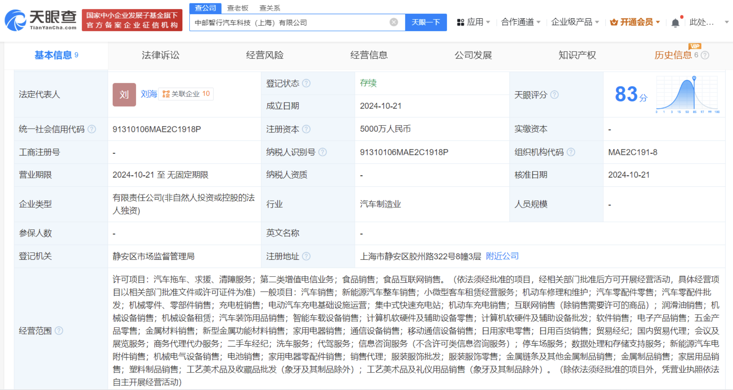 天眼查App显示,近日,中邮智行汽车科技(上海)有限公司成立,法定代表人为刘海,注册资本5000万人民币,经营范围含汽车拖车、求援、清障服务,第二类增值电信业务,新能源汽车整车销售,小微型客车租赁经营服务,互联网销售,智能车载设备销售等。股东信息显示,该公司由中国邮电器材集团有限公司全资持股。