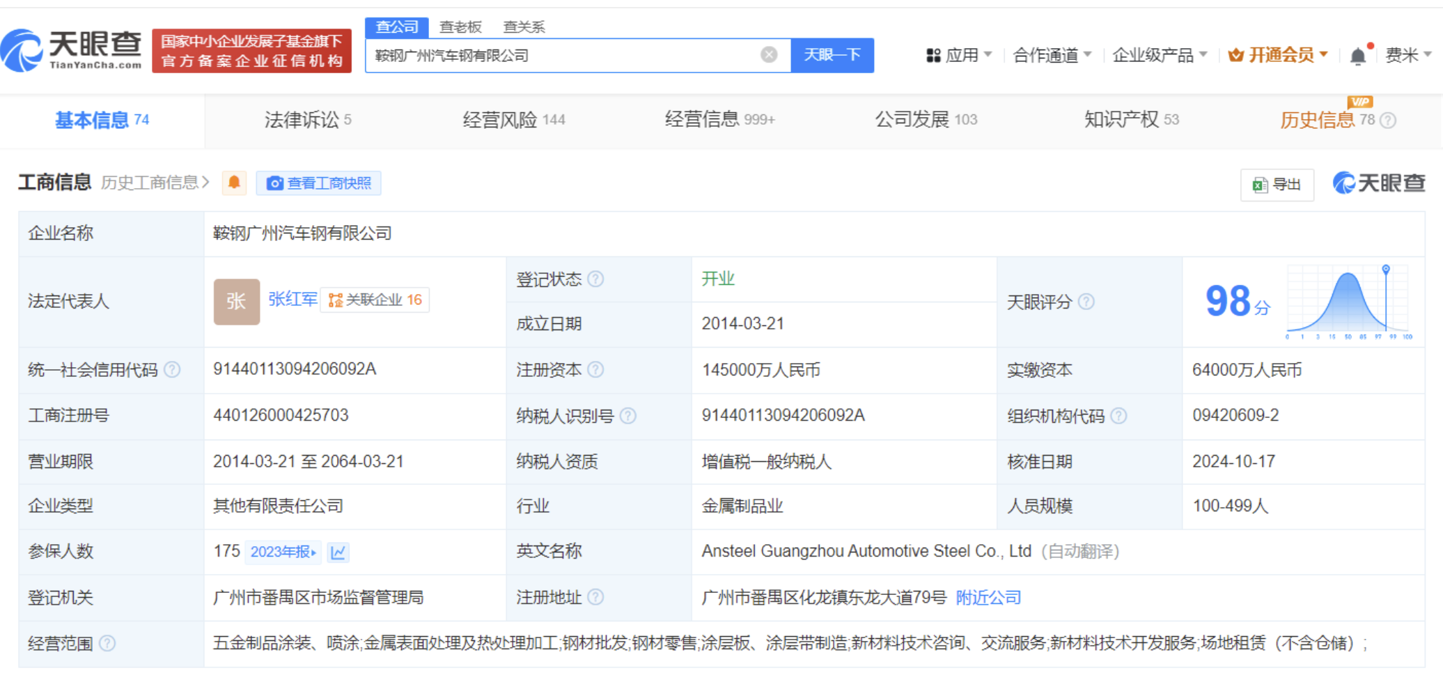 该公司成立于2014年3月,法定代表人为张红军,经营范围含金属表面处理及热处理加工、钢材批发、钢材零售等。股权全景穿透图显示,该公司由鞍钢股份(000898)及旗下鞍钢蒂森克虏伯汽车钢有限公司、广汽集团(601238)旗下广汽商贸有限公司共同持股。