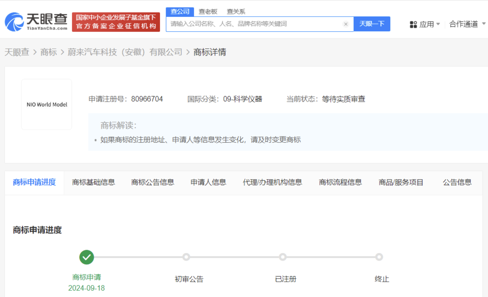 天眼查知识产权信息显示,近日,蔚来汽车科技(安徽)有限公司申请注册3枚“蔚来世界模型”“NIO World Model”文字及图形商标,国际分类为科学仪器,当前商标状态均为等待实质审查。
