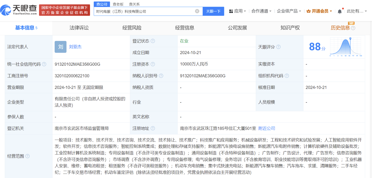 天眼查App显示,近日,时代电服(江苏)科技有限公司成立,法定代表人为刘亚杰,注册资本1亿人民币,经营范围含科技推广和应用服务、机械设备研发、人工智能应用软件开发、信息技术咨询服务、智能控制系统集成、新能源汽车换电设施销售等。股权全景穿透图显示,该公司由时代电服科技有限公司全资持股,后者为宁德时代(300750)全资子公司。