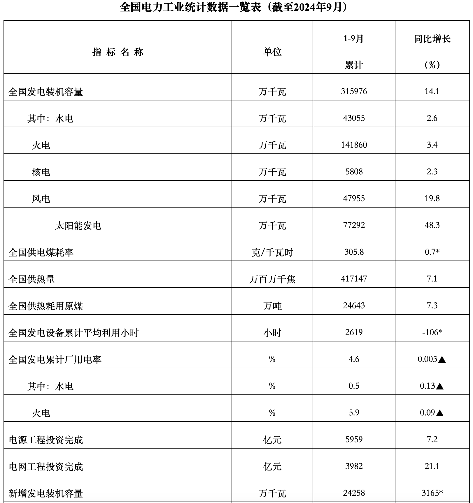 10月21日,国家能源局发布1-9月份全国电力工业统计数据。