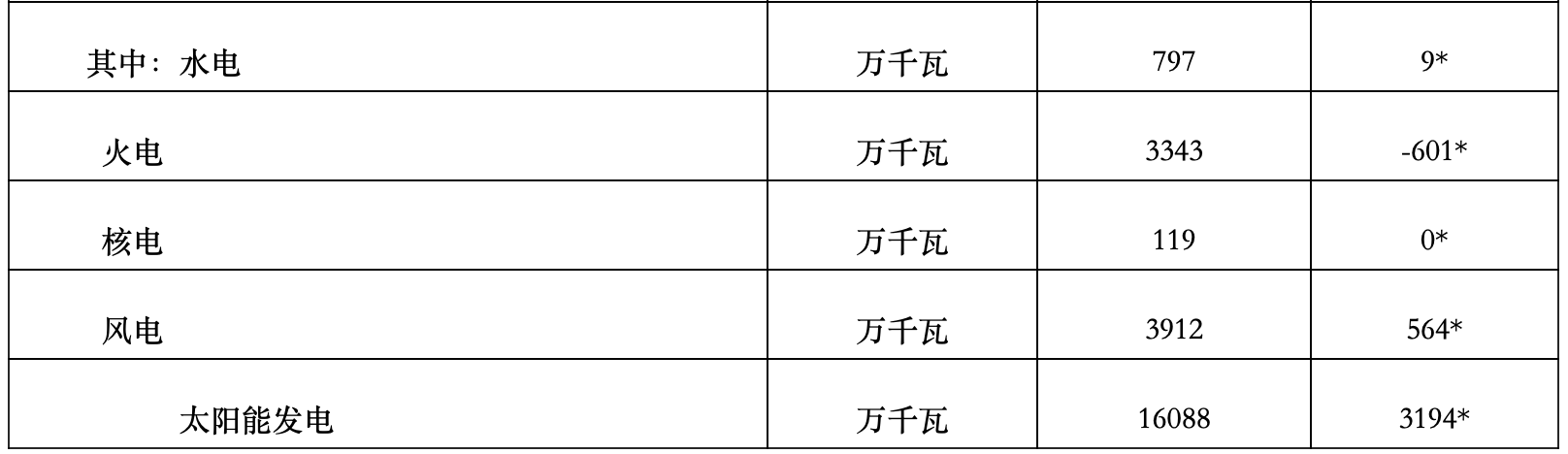 截至9月底,全国累计发电装机容量约31.6亿千瓦,同比增长14.1%。其中,太阳能发电装机容量约7.7亿千瓦,同比增长48.3%;风电装机容量约4.8亿千瓦,同比增长19.8%。