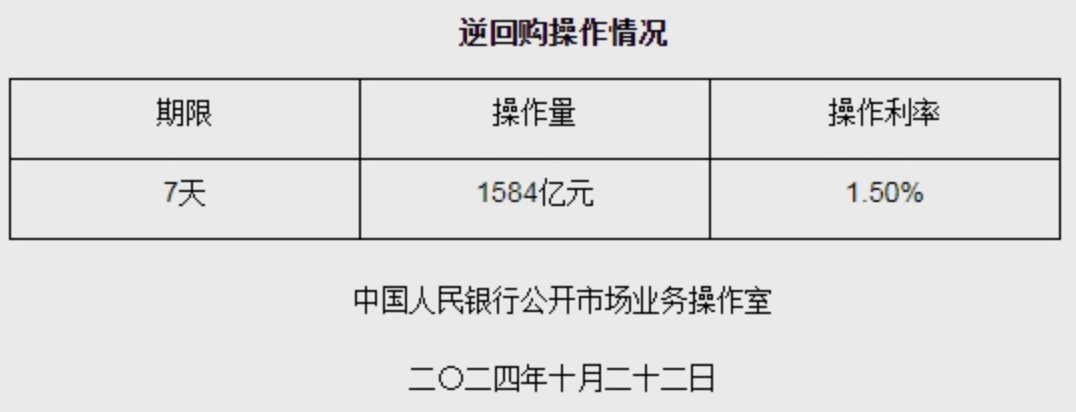为维护银行体系流动性合理充裕,2024年10月22日人民银行以固定利率、数量招标方式开展了1584亿元逆回购操作。具体情况如下:
