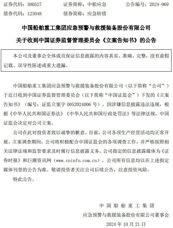 10月21日晚间,中船应急(300527)公告,公司于近日收到中国证监会下发的《立案告知书》,因涉嫌信息披露违法违规,中国证监会遭决定对公司立案。