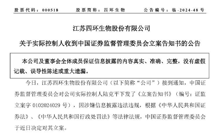 10月21日晚间,四环生物(000518)公告,公司实际控制人陆克平因涉嫌信息披露违法违规,收到证监会的立案告知书。