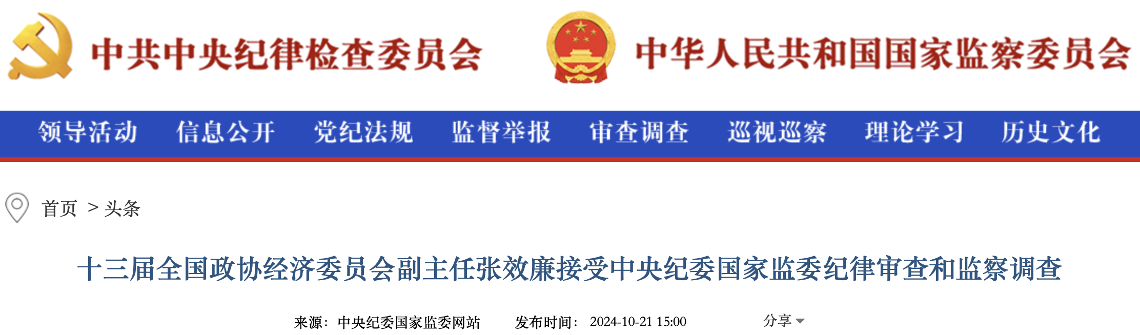 中央纪委国家监委网站10月21日消息,十三届全国政协经济委员会副主任张效廉涉嫌严重违纪违法,目前正接受中央纪委国家监委纪律审查和监察调查。