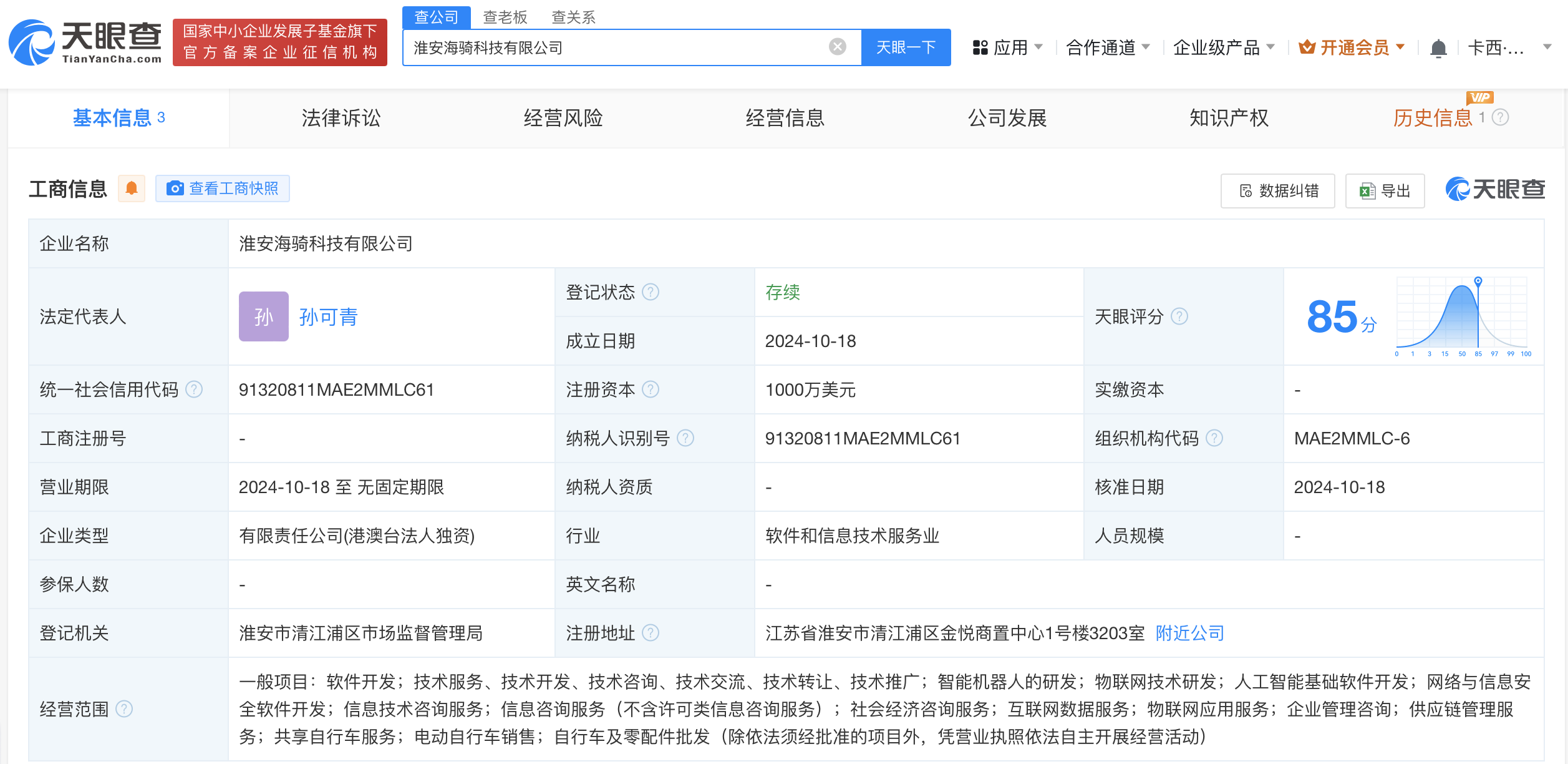 天眼查App显示,近日,淮安海骑科技有限公司成立,法定代表人为孙可青,注册资本1000万美元,经营范围含智能机器人的研发、人工智能基础软件开发、共享自行车服务等。股东信息显示,该公司由美团旗下Xigua Limited全资持股。